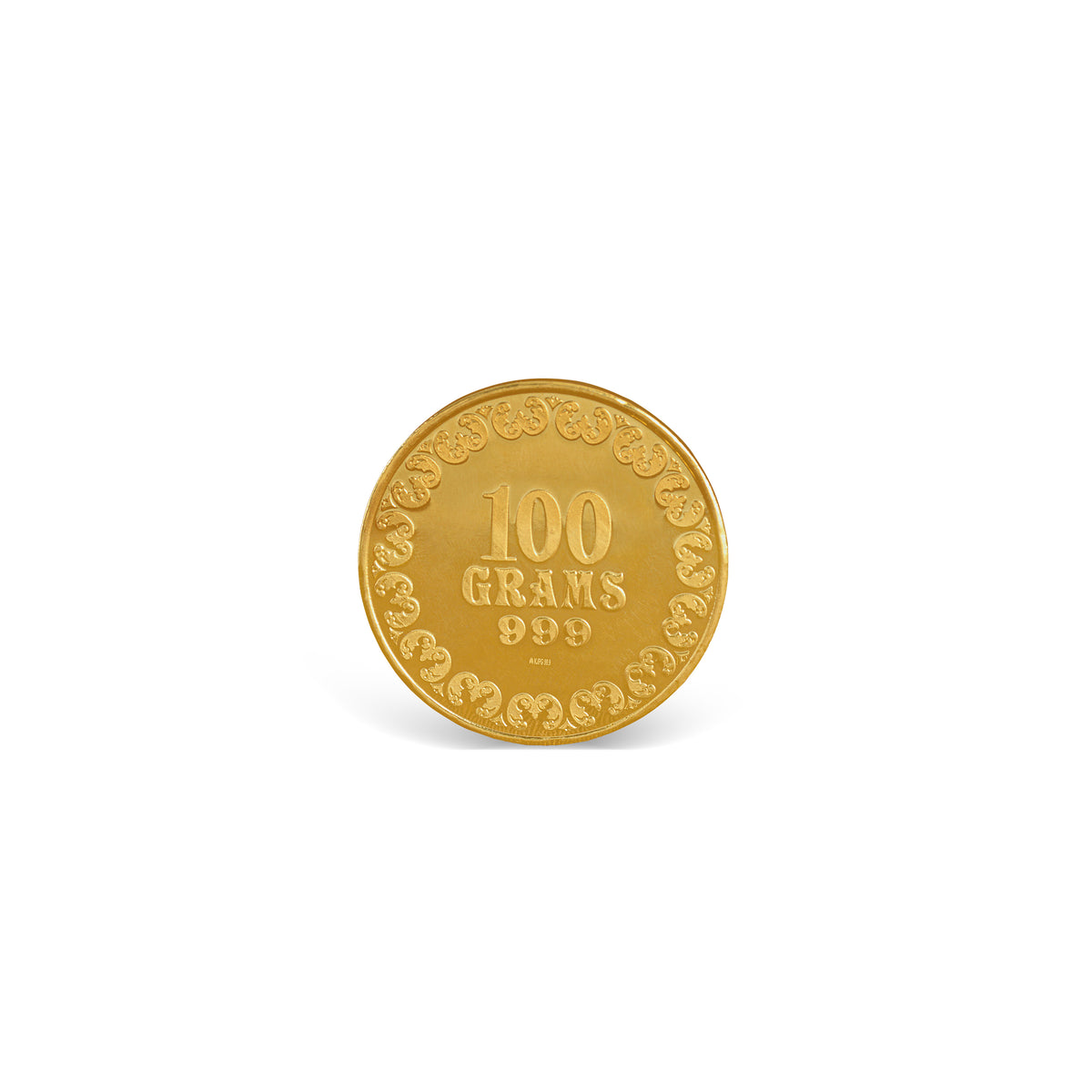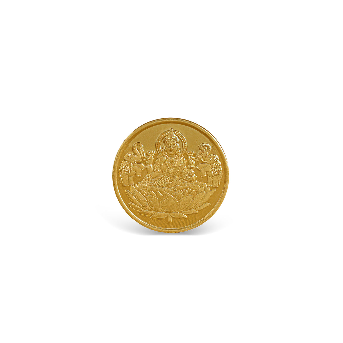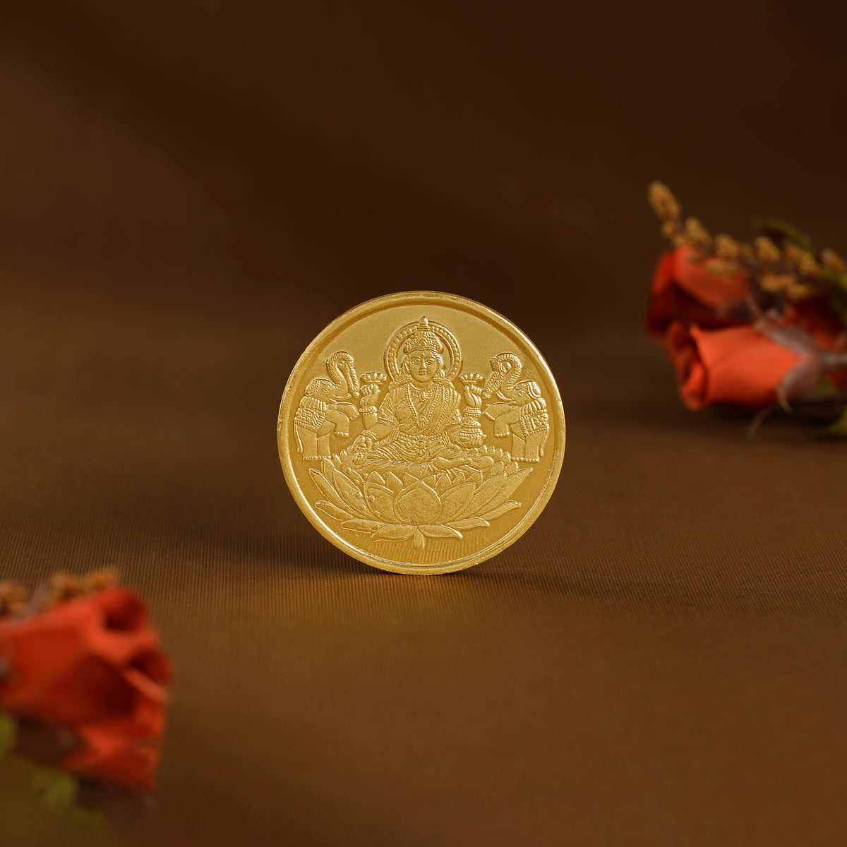 Immerse yourself in grandeur with this gorgeous 24kt pure gold necklace, painstakingly made with elaborate engravings of Goddess Laxmi and a majestic elephant.