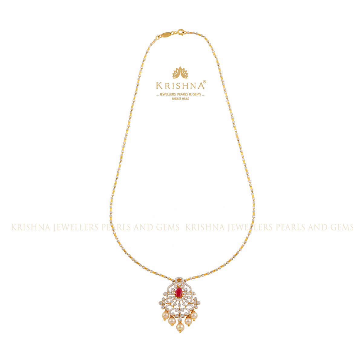 This elegant pendant features traditional curvy and flower motifs, giving it an ethnic touch. The center colorstone adds a striking element, while the pearls enhance its classic design. Crafted with a mix of white and yellow gold, the chain offers a unique and sophisticated appearance.