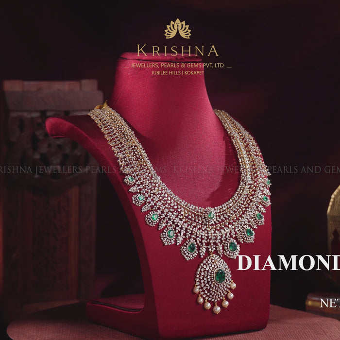 A stunning 18K diamond bridal long haar necklace adorned with vibrant emeralds, expertly handcrafted for timeless elegance. Its luxurious design adds royal charm, making it the perfect statement piece for weddings, receptions, and grand celebrations.