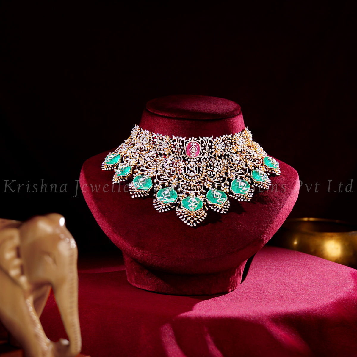This luxurious diamond choker features intricate filigree craftsmanship with brilliant-cut diamonds set in yellow gold. Accented with cascading turquoise gemstones and a central pink stones, it blends traditional Indian motifs with contemporary elegance—perfect for weddings and grand celebrations.