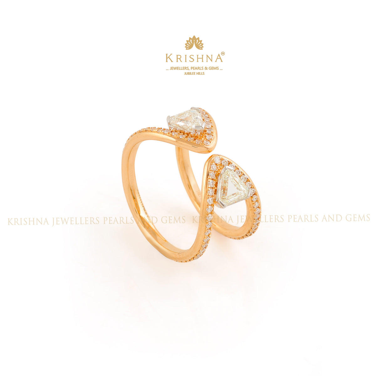 This unique open shank ring features a minimalist design that adds elegance to any outfit. A distinctive trillion cut stone is surrounded by sparkling diamonds on the shank, enhancing its uniqueness. The ring is designed with two shanks, giving it a broad appearance that stands out beautifully.