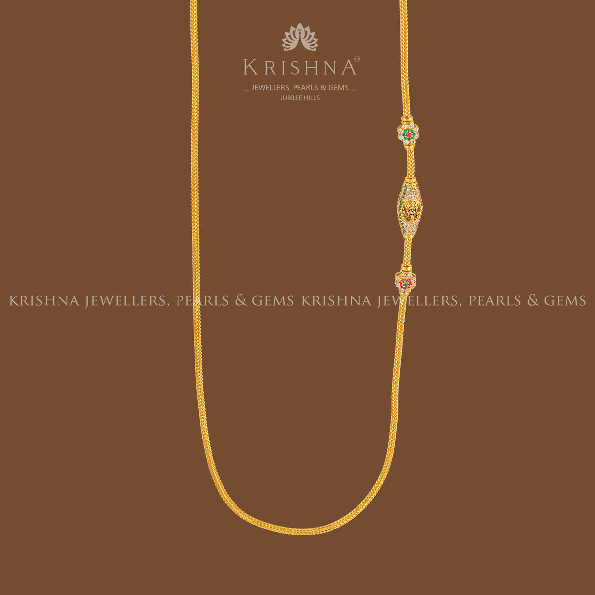 Introducing an exquisite 22k gold chain meticulously handcrafted with the divine Lakshmi motif. This elegant masterpiece graces your neck while enhancing your spiritual presence, radiating an aura of divine abundance and grace. It transcends mere jewelry, symbolizing spirituality and opulence beautifully entwined in gold, reflecting your inner radiance.