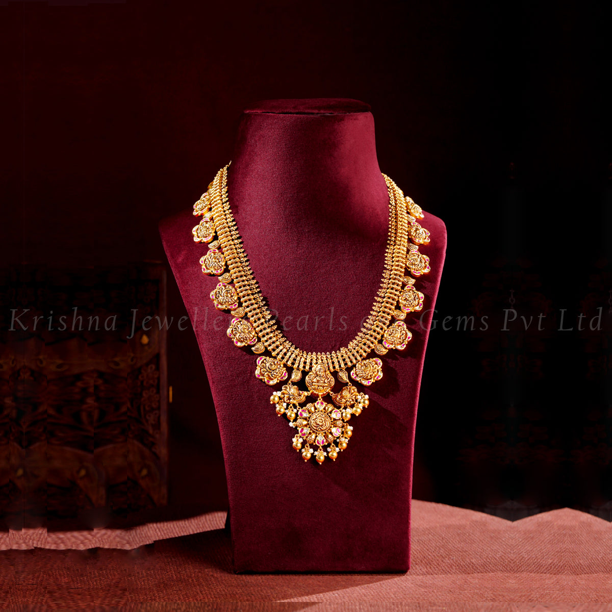 Embrace divine elegance with this 22K gold long necklace, crafted in traditional South Indian style. Featuring peacock motifs, Lakshmi coin designs, a grand Lakshmi pendant, and intricate nakshi work, it is adorned with diamonds, pearl drops, and ruby pota stones. Finished in a rich antique polish, this temple jewellery is perfect for weddings, festivals, and cultural celebrations.