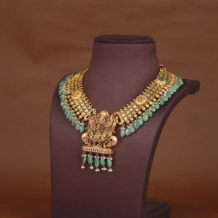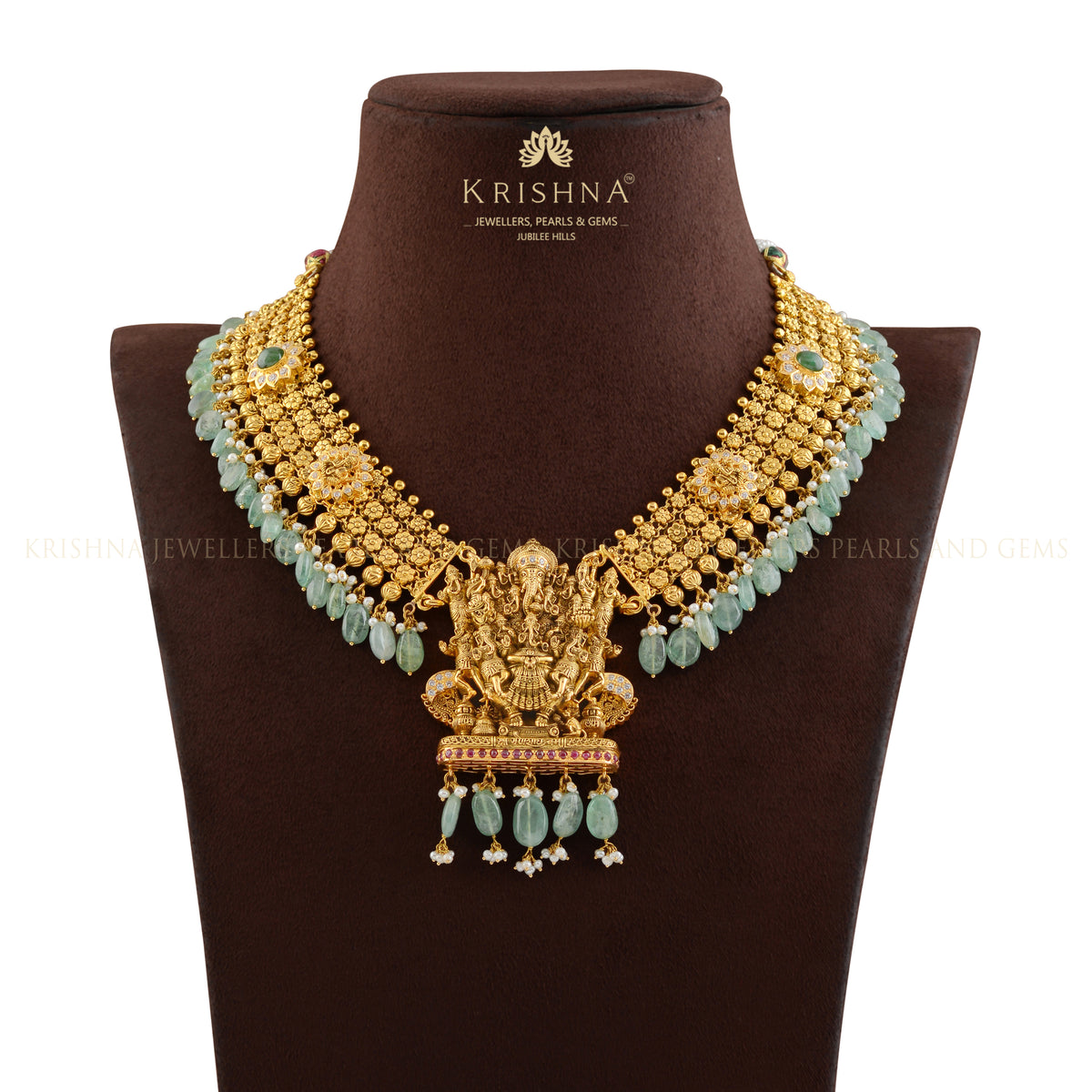 Indulge in timeless elegance with our Temple Gold Necklace. Immerse yourself in the divine allure of Ganesha's motif, embellished with radiant rubies, emerald beads, and pearls. Each intricate detail tells a story of grace and heritage, making it more than a necklace—it's a symbol of tradition and beauty. Elevate your presence with this exquisite piece, a harmonious blend of spirituality and sophistication. Let the shimmering gold and vibrant gemstones accentuate your grace, creating a captivating aura that resonates with opulence and tradition. Adorn yourself in the artistry of heritage, where every bead and curve reflects a tale of divine beauty. Embrace the richness of culture and adornment, making a statement that transcends time.