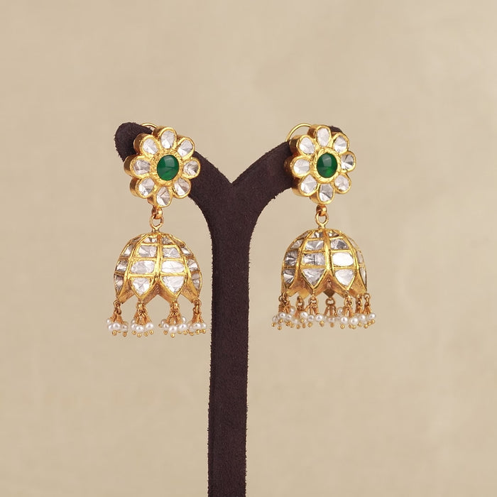 A beautiful pair of 22k gold polki jhumka earrings crafted with emerald. These earrings are lightweight and easy to wear.