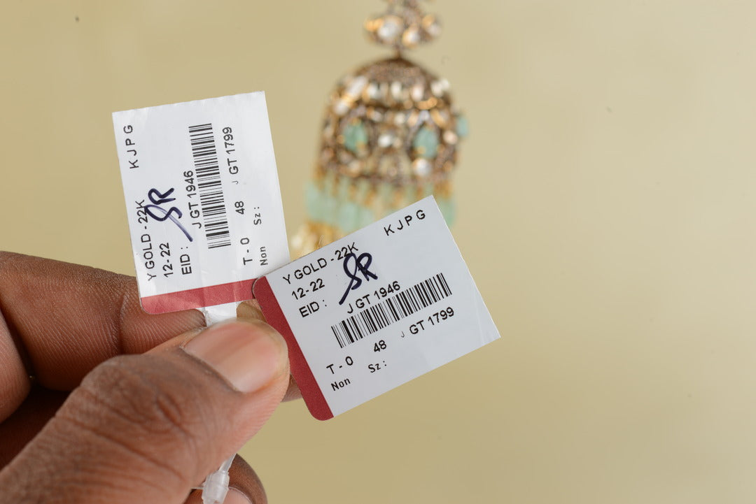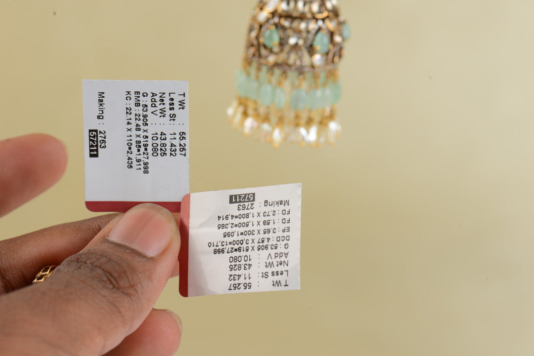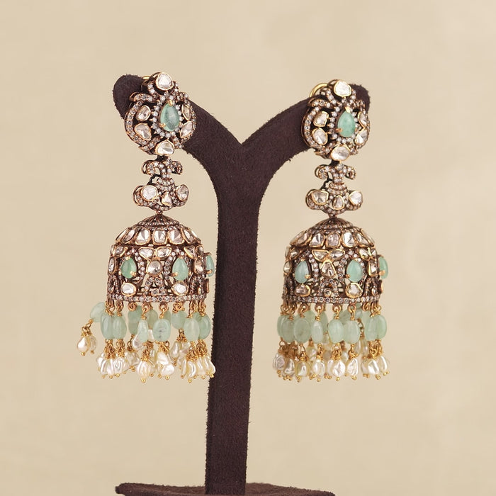 Find the perfect gift for her with these 22k Victorian Emerald Polki Jhumka Earrings. These earrings are expertly handcrafted, featuring a beautiful design and a stunning finish that creates a look that is sure to dazzle.