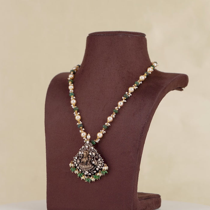 Explore our 18K Victorian Gold Polki Necklace, featuring a stunning Laxmi Devi design pendant that symbolizes wealth and prosperity. Adorned with beautiful cultured pearls and unique Karbuja beads, this necklace adds a touch of elegance and richness. The Polki stones, set in high-quality 18K gold, reflect light beautifully, making it a standout piece in your jewelry collection.
