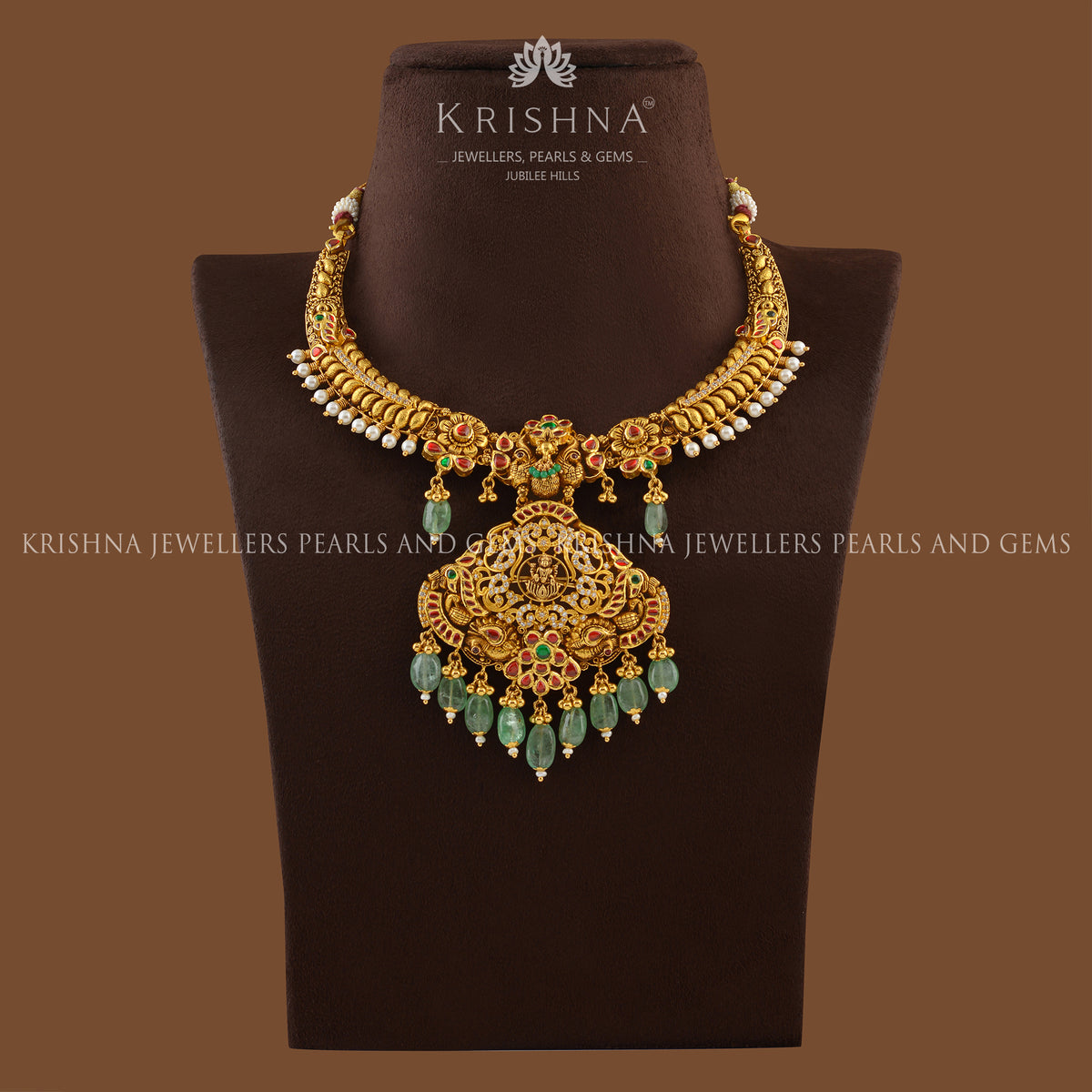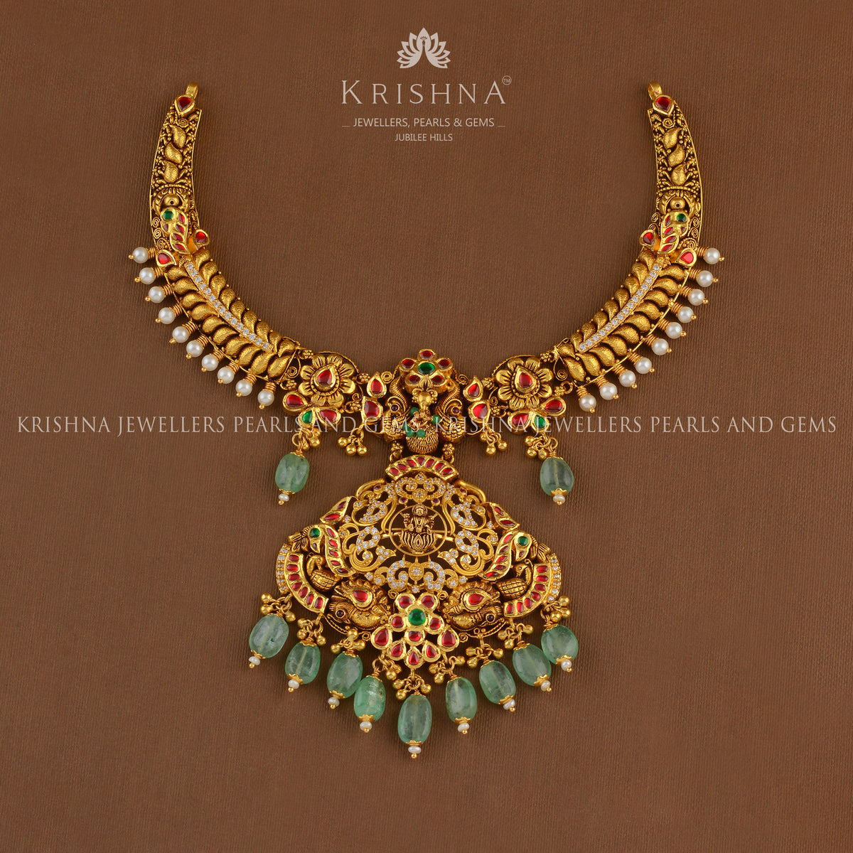 Crafted from pure 22K gold, the Divine Gold Kanti Necklace is a masterpiece of traditional beauty. With a mesmerizing blend of Goddess Laxmi design and stunning pieces of Russian emerald beads and pearls, it brings a touch of opulence to any occasion, making you shine with grace and charm. This kanti gold necklace is the perfect addition to any traditional outfit.