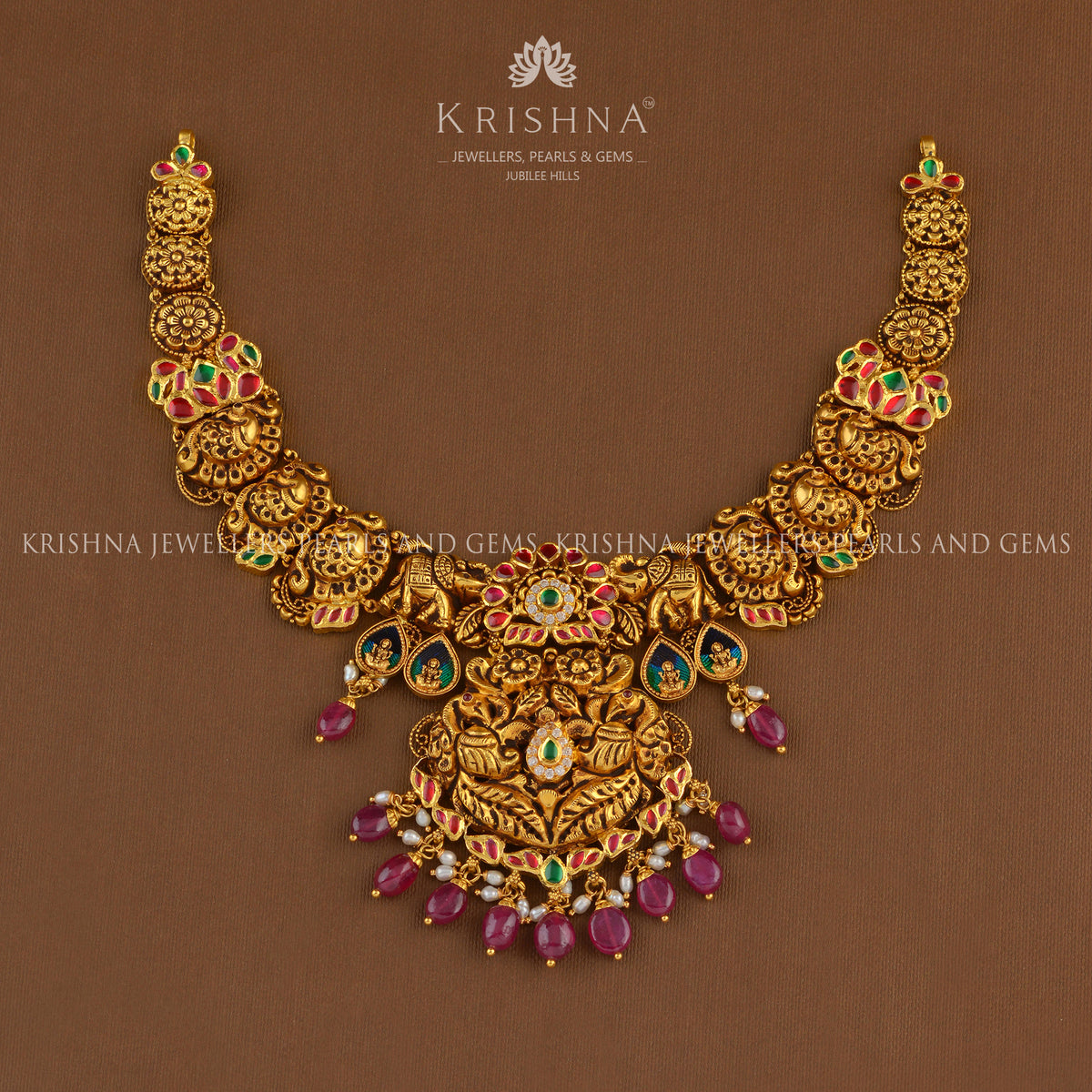 Add a captivating look to your overall appearance with this gold necklace. crafted in 22k gold with Nakshi's work. This mesmerizing piece of gold necklace is a masterpiece that will captivate all who lay eyes on it. With its rich gold and meticulous detailing, this necklace is a statement of exceptional beauty and grace. Embrace luxury and make a statement with this gold masterpiece.