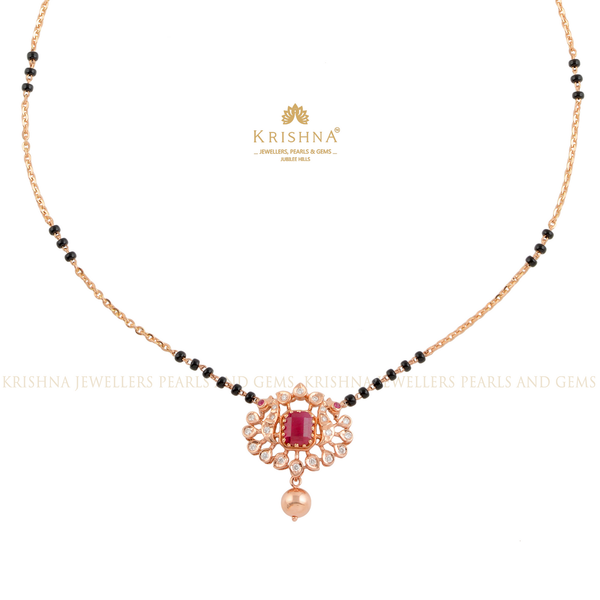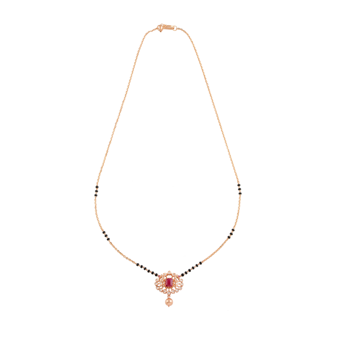 This elegant mangalsutra features a minimal design inspired by a peacock. The unique oval pendant showcases a paisley motif and a center colored stone, completed with dangling gold balls for added charm. The chain is crafted from black beads and gold, arranged to beautifully highlight the pendant.
