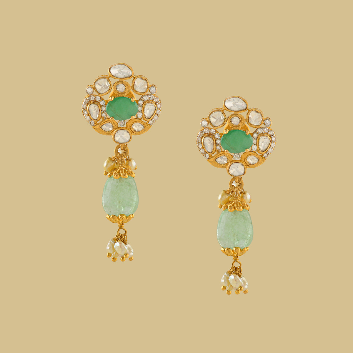 Elegant polki stud earrings adorned with graceful emerald drops. A harmonious fusion of traditional and contemporary elements, adding a touch of sophistication to any outfit.