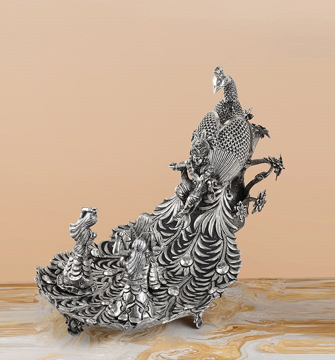 This lovely silver show piece is heavily crafted in 92.5 Silver. It has the delicate details of peacock feathers and forms crafted onto it. It has a majestic appeal and it can be used as a statement piece for home decoration.
