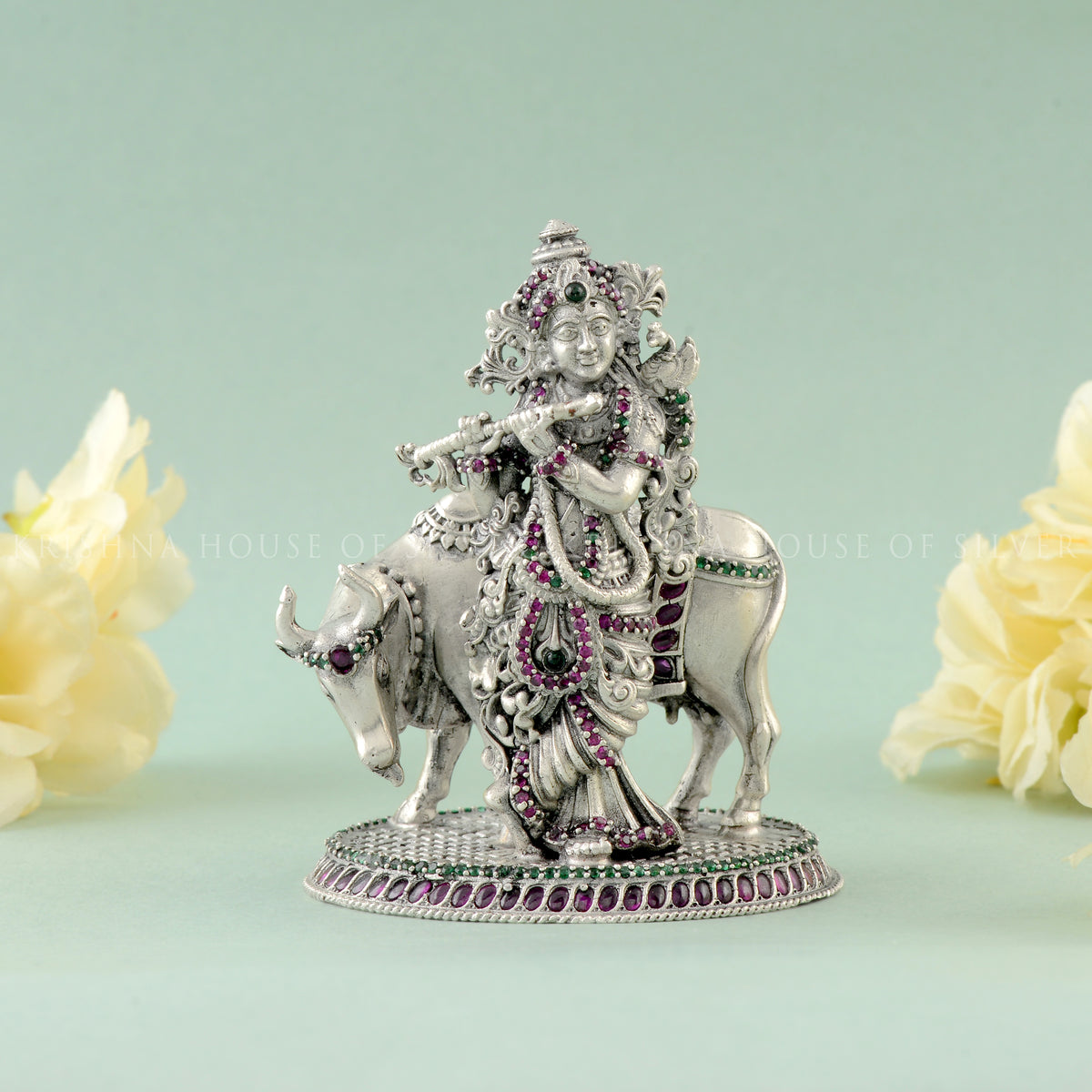 Divine Grace: Experience divine grace with this intricately crafted 92.5 Silver Cow Krishna Idol, a beautiful representation of love and devotion.