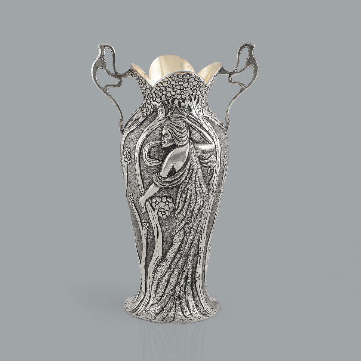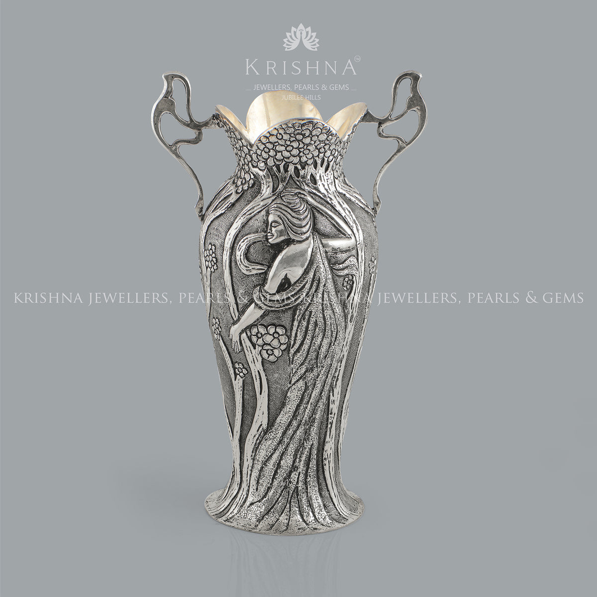 This antique-finished silver vase combines traditional beauty with artistic flair. It is engraved with contemporary elements.