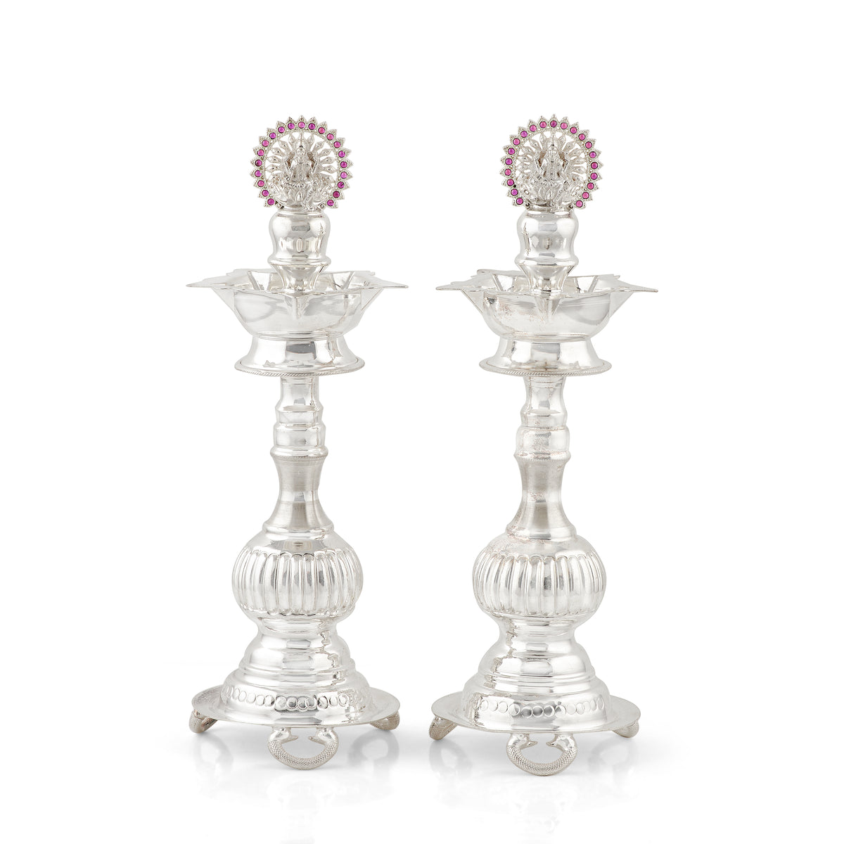 Illuminate your prayers and festivities with this divine pair of 92.5 pure silver Deepam stands. Each elegant stand is beautifully adorned with a vibrant red stone Ganesh motif at the top, adding a touch of sacred beauty and auspiciousness. Perfect for daily pooja, special ceremonies, or as a striking addition to your home temple, these silver Deepam stands combine traditional design with intricate detailing. Crafted from high-quality sterling silver, they offer a radiant shine and lasting elegance for your spiritual practices.