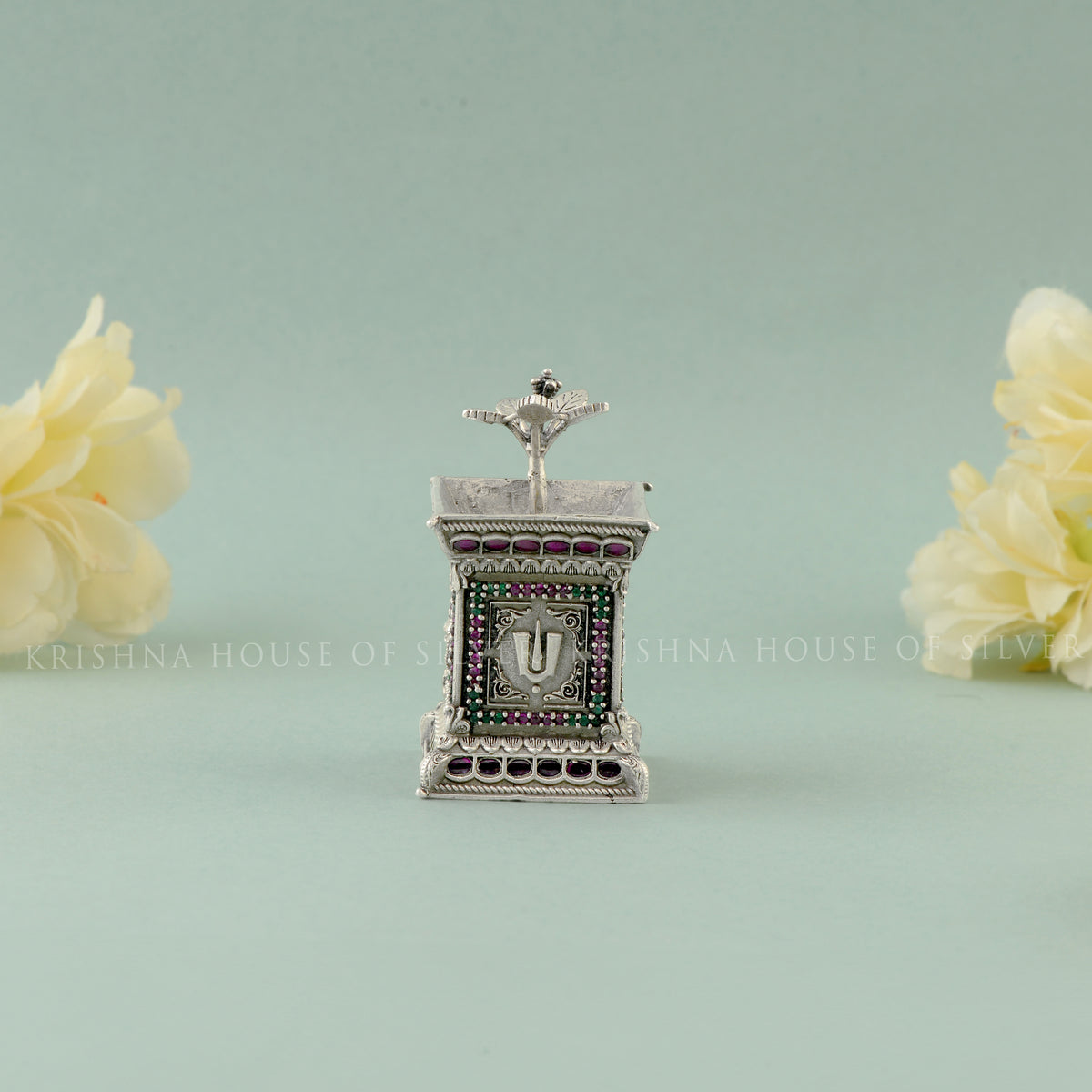 Elegance and Spirituality: Adorned with precious stones, this Tulasi Kota radiates elegance and spirituality, enhancing the ambiance of your sacred space.