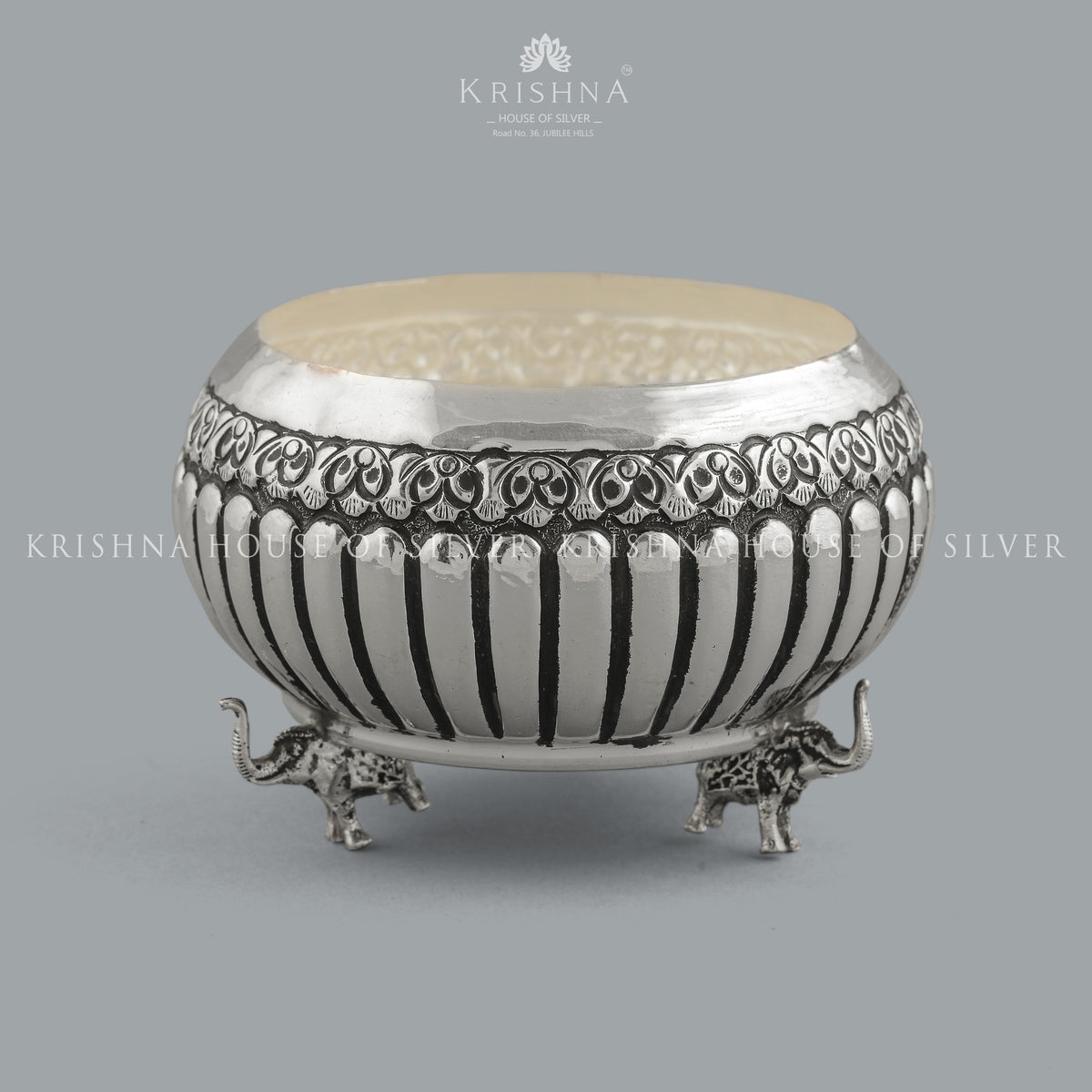 Add a spiritual aura to your home with an antique silver bowl that features a beautiful elephant motif, exuding spiritual charms to any space or pooja room. The intricate detailing on the bowl showcases the skill and craftsmanship of the artisans who created it. The silver bowls add a timeless appeal with a modern touch, making them a perfect addition to any antique collection. This silver bowl is crafted in a 925 pure silver supporting stand that has been crafted in an elephant design. Decorate on a shelf or command attention in the pooja room as this bowl is designed to inspire every one. Its perfect shape and dimension allows for a variety of uses, from holding kumkum to serving prasadam or displaying flowers. With its unique design and rich history, this antique silver bowl is a true treasure.