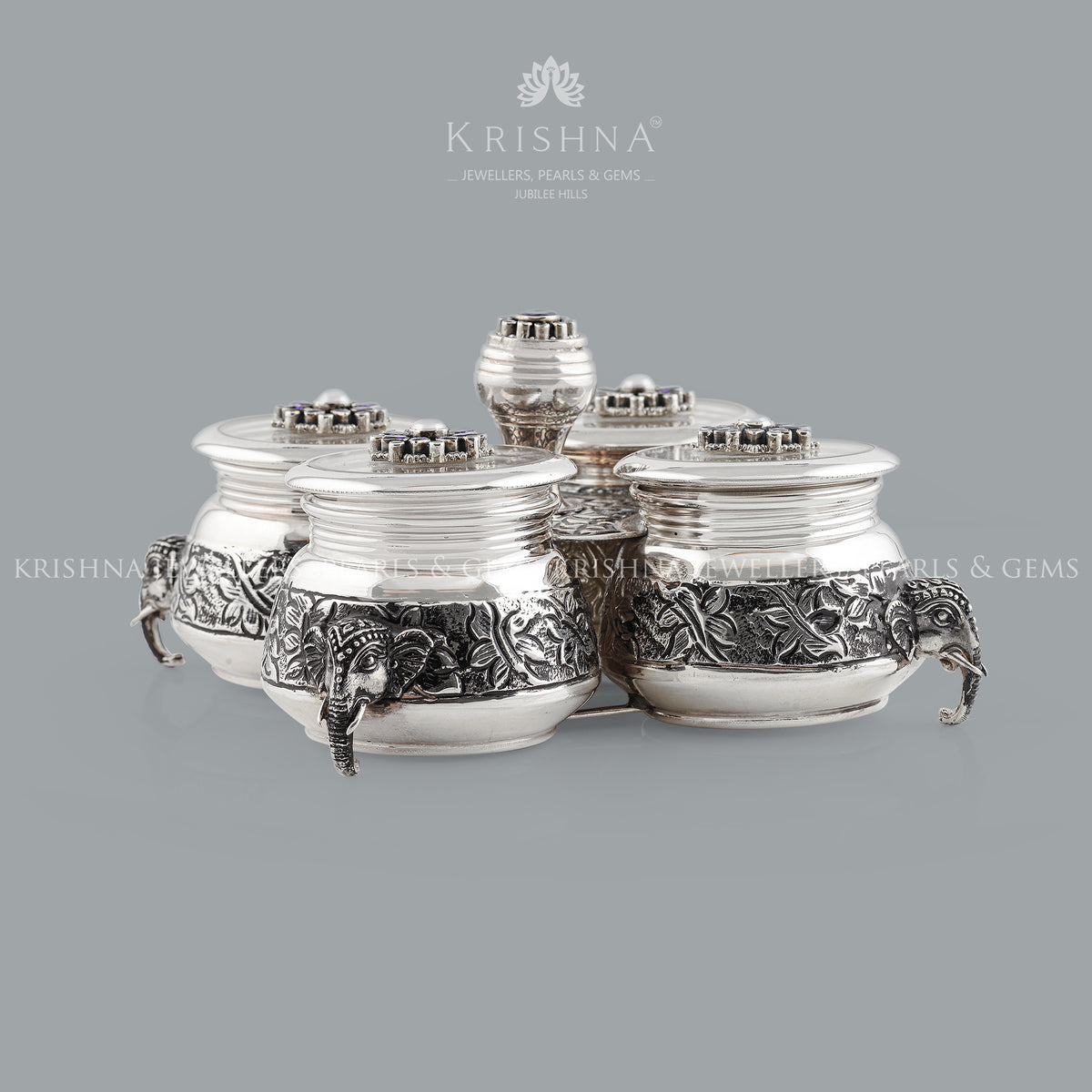 This exquisite set of four silver Kumkum barnis showcases an artistic elephant head motif on its side, complemented by an elegant antique finish. The lid features a skillfully embedded gemstone in a captivating floral design, enhancing its overall charm and allure.