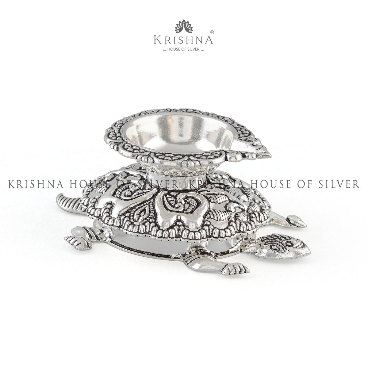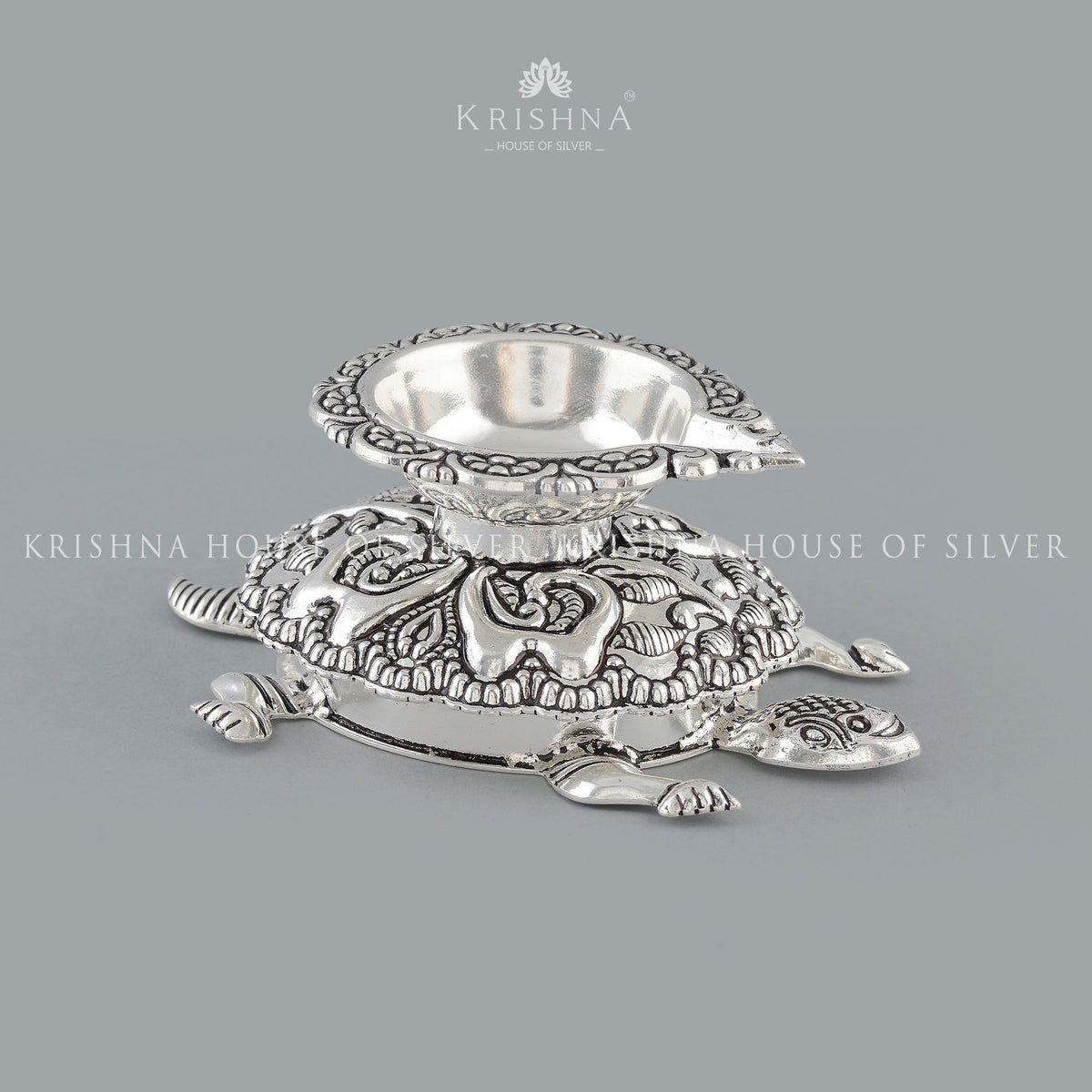 Invoke your home's ambiance with this exquisite 925 silver tortoise diya. A timeless symbol of longevity, stability, and prosperity across diverse cultures, it serves as an emblem of positive energy and blessings. Its intricate craftsmanship and shimmering silver radiate an aura of elegance and tradition. Lighting this diya during sacred rituals and celebrations not only illuminates your space but also invokes an atmosphere of serenity and spiritual significance. Elevate your decor and invite an abundance of positive vibes with this silver tortoise diya, a cherished addition that beautifully amalgamates tradition and grace into your living space.