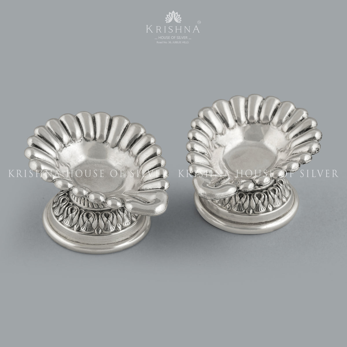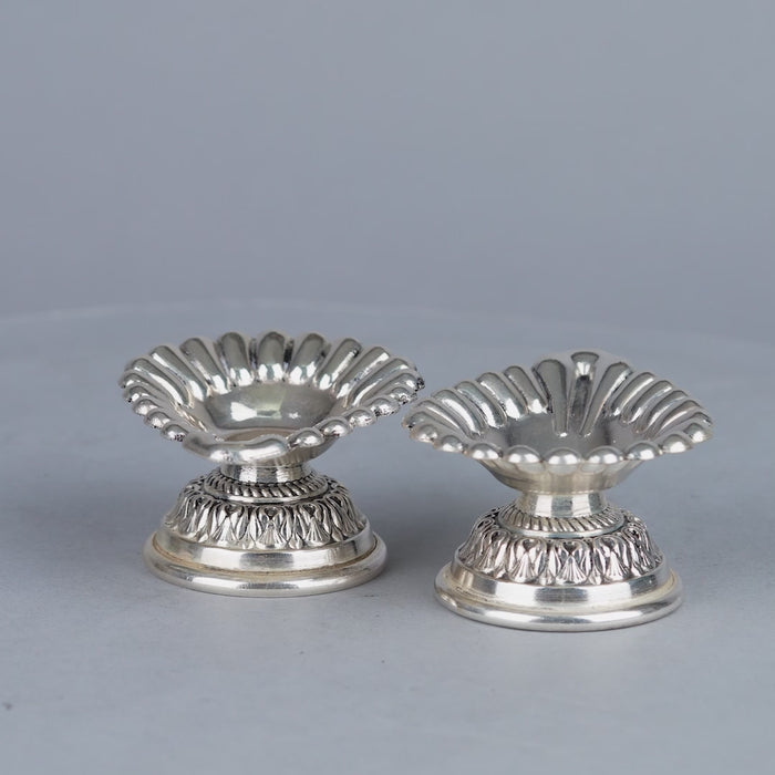 Immerse yourself in a spiritual aura with the Silver Diya Pair, a remarkable embodiment of silver pooja craftsmanship radiating grace and allure. Meticulously handcrafted in 925 pure silver with unwavering precision and devotion, this pair of silver diya is made from premium silver and illuminates positive vibes. Every silver diya within this pair showcases intricate detailing and boasts a one-of-a-kind design, transforming each into a genuine masterpiece. Whether you find yourself at a wedding, amidst an upcoming joyous Deepavali festival, or celebrating a cherished moment, these silver diyas are destined to leave an indelible impression.