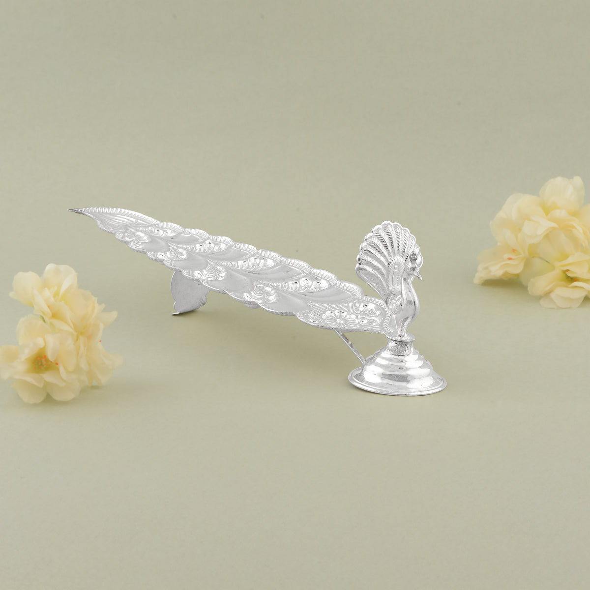 Adorn your sacred space with this exquisite 92.5 pure silver stand, elegantly designed with a prominent peacock motif. The fanned peacock tail forms a captivating backdrop, while the intricate detailing on the stand showcases traditional craftsmanship. This versatile piece serves as a beautiful decorative accent for your pooja altar or home, and can subtly hold an incense stick or a small incense cone, allowing the fragrance to enhance your spiritual ambiance. Crafted from high-quality sterling silver, this stand radiates purity and auspiciousness, symbolizing grace and beauty in Indian culture. It makes a thoughtful gift for any devotee or a cherished addition to your collection.