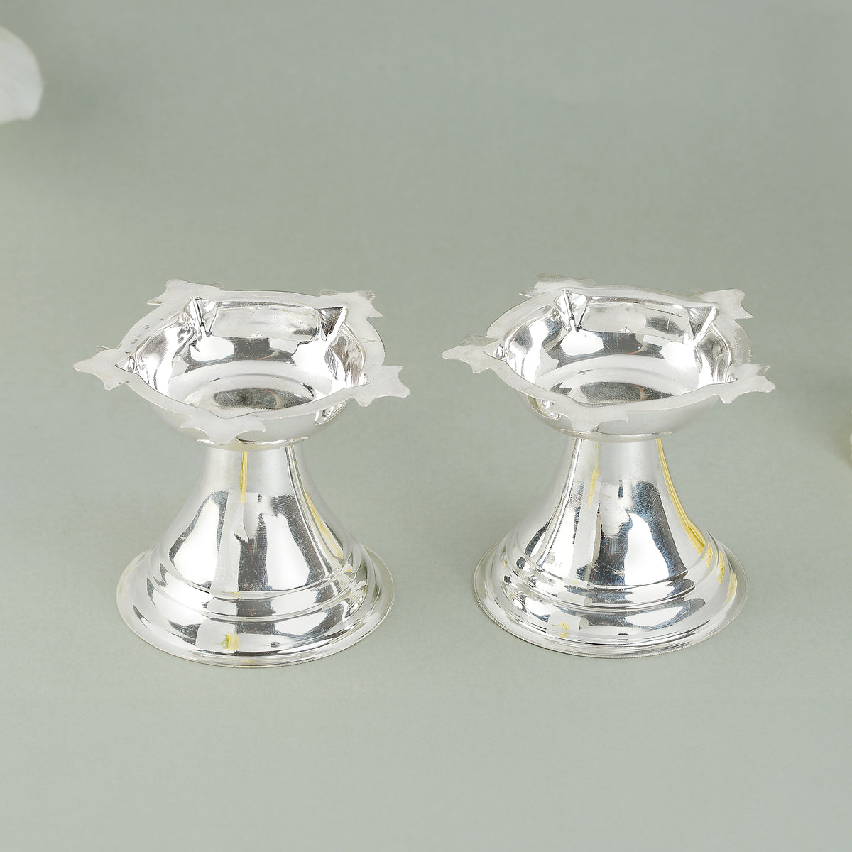 This Silver 5-Vattulu Diya Stand Crafted 92.5 is expertly made with high-quality silver, featuring 5 Vattulu for elegant and practical lighting. Crafted with a purity of 92.5, this stand promises durability and a polished shine. Perfect for adding a touch of sophistication to any space.