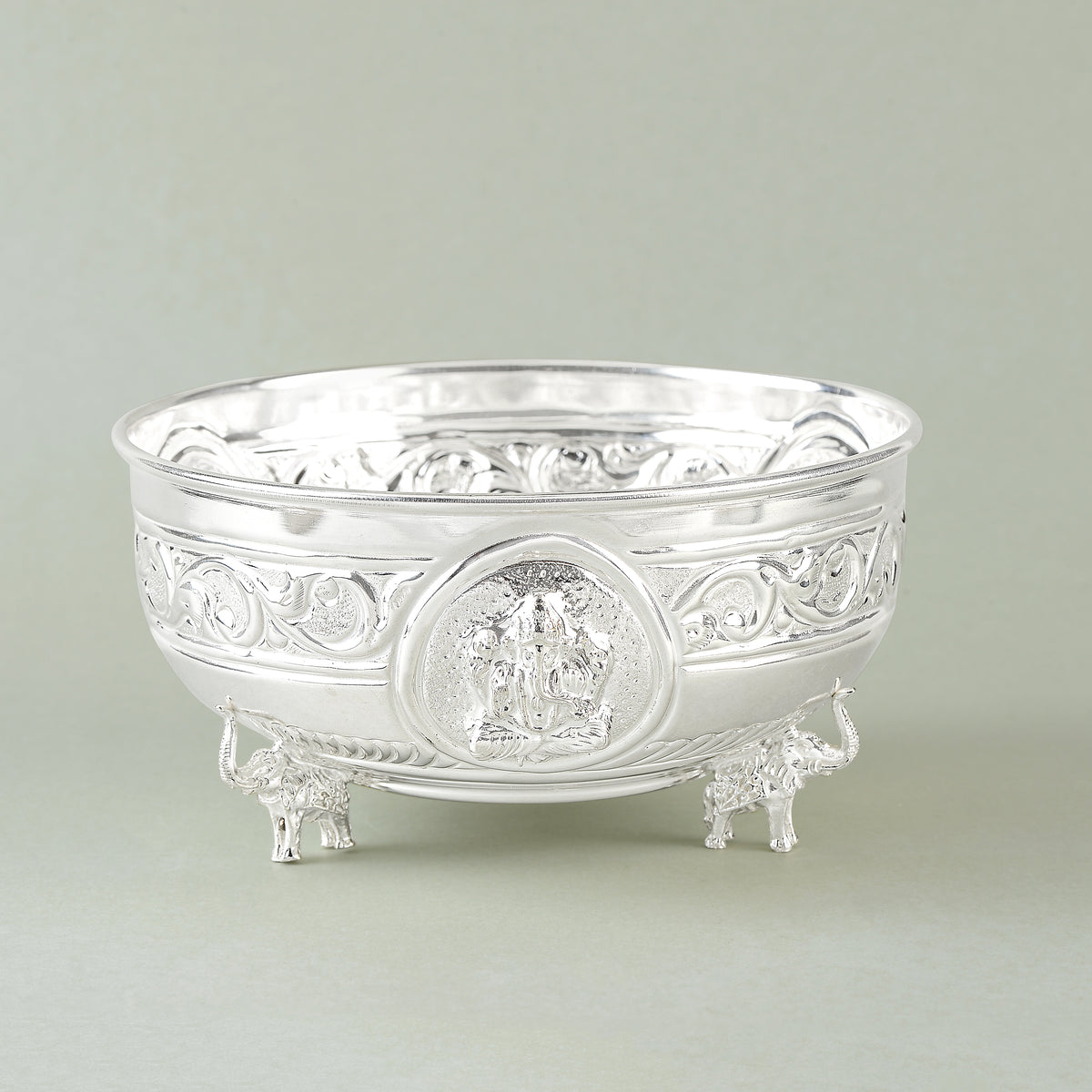 This silver bowl, supported by a graceful elephant pedestal and decorated with Ganesha and swirly patterns, is perfect for flowers or water
