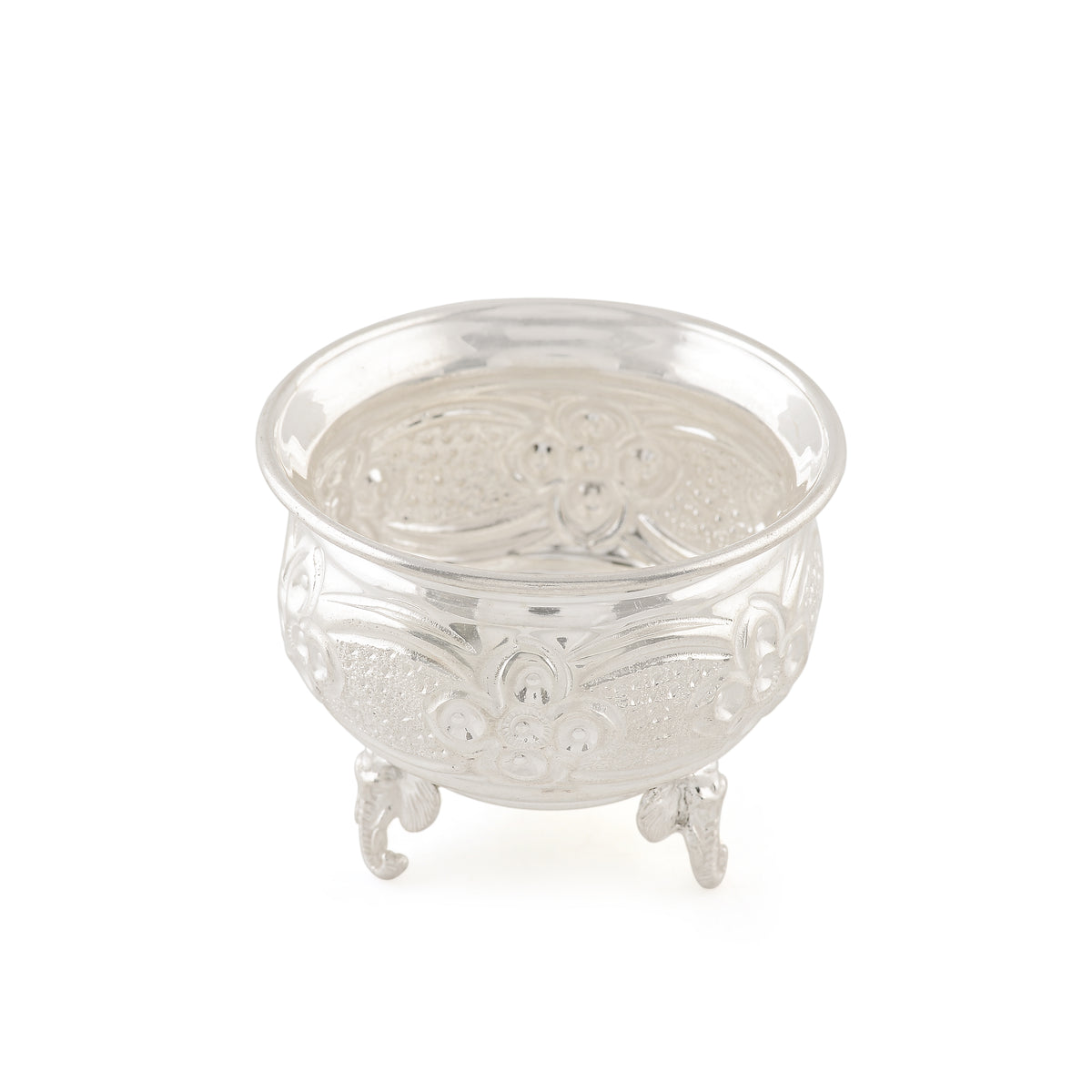 Elevate your home decor with this exquisite Silver Bowl featuring a unique Three Elephant Legs Design. Made from high-quality silver, this bowl adds a touch of elegance to any room. Its sturdy construction and intricate design make it both functional and visually appealing. Upgrade your space with this must-have piece.