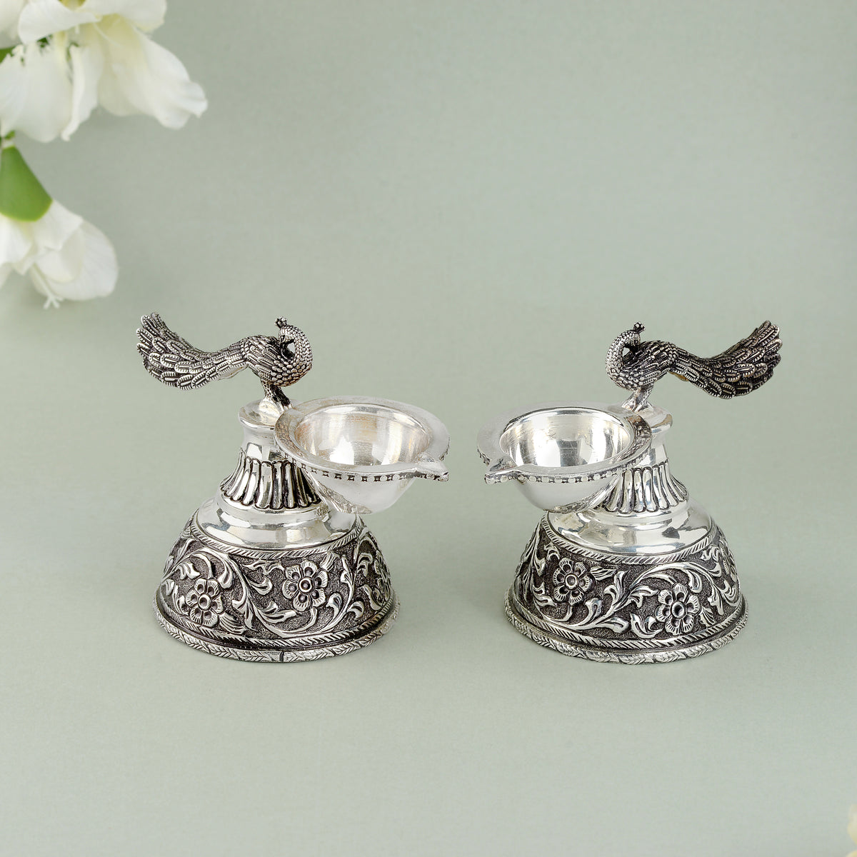This traditional Silver Diya features a stunning Floral Peacock design. Crafted with high-quality silver, it adds an elegant touch to any festive occasion. Bring traditional charm and auspiciousness to your home with this beautifully designed deepam.