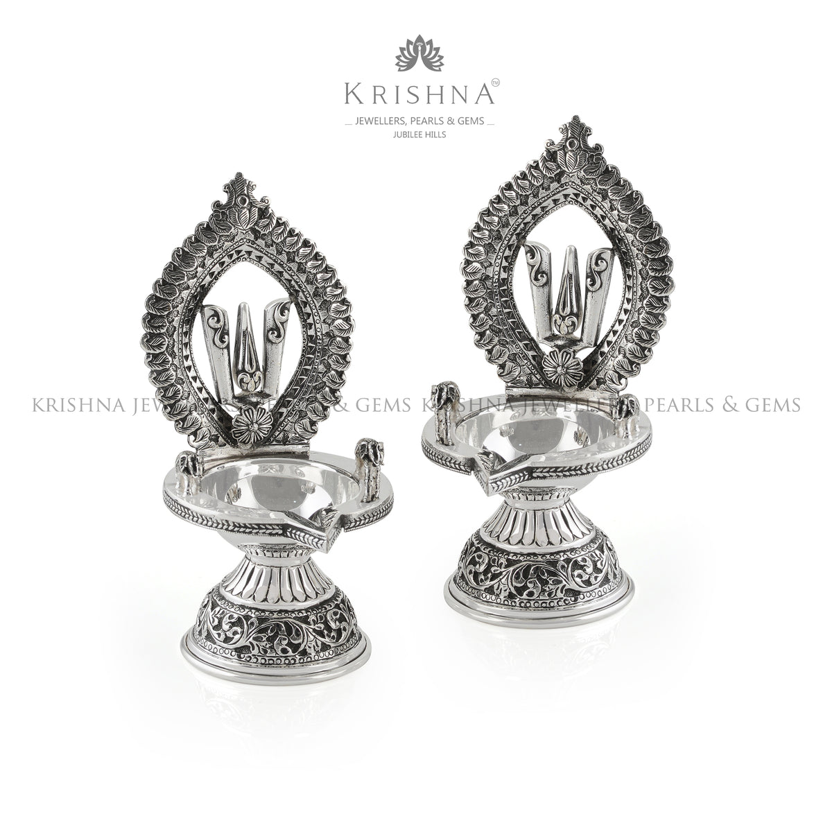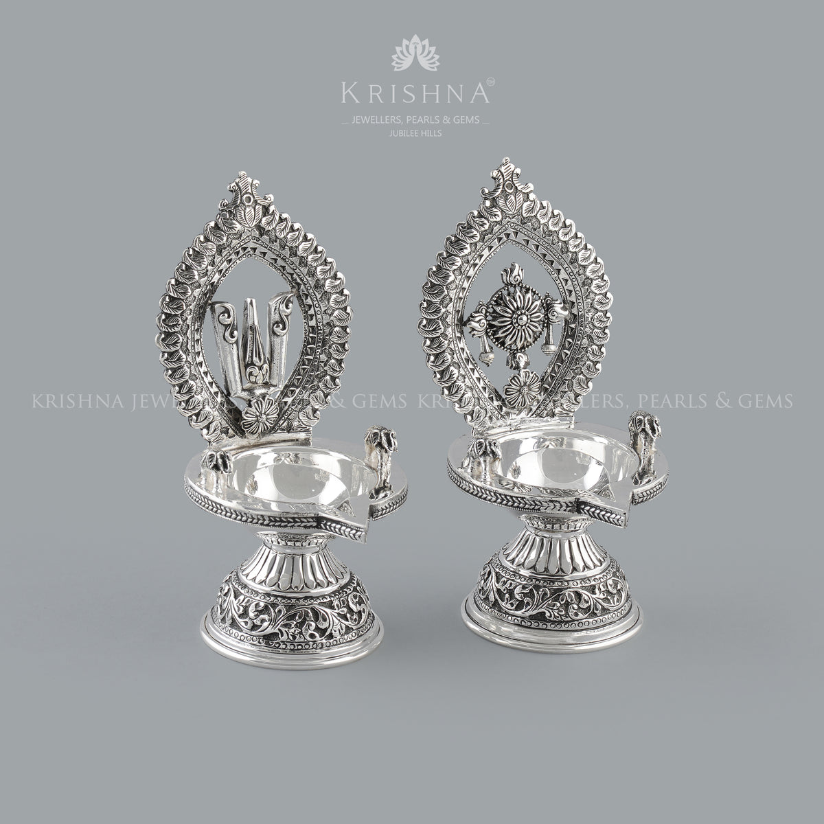 Silver Diya in Shanka Chakra Motif is a stunning piece of art that showcases the beauty and elegance of Indian craftsmanship. This intricately designed diya features a shank chakra motif, which symbolizes prosperity and good luck. Made from 925 pure silver, this diya is not only a decorative item but also a functional one, perfect for lighting up your home during festivals and special occasions.