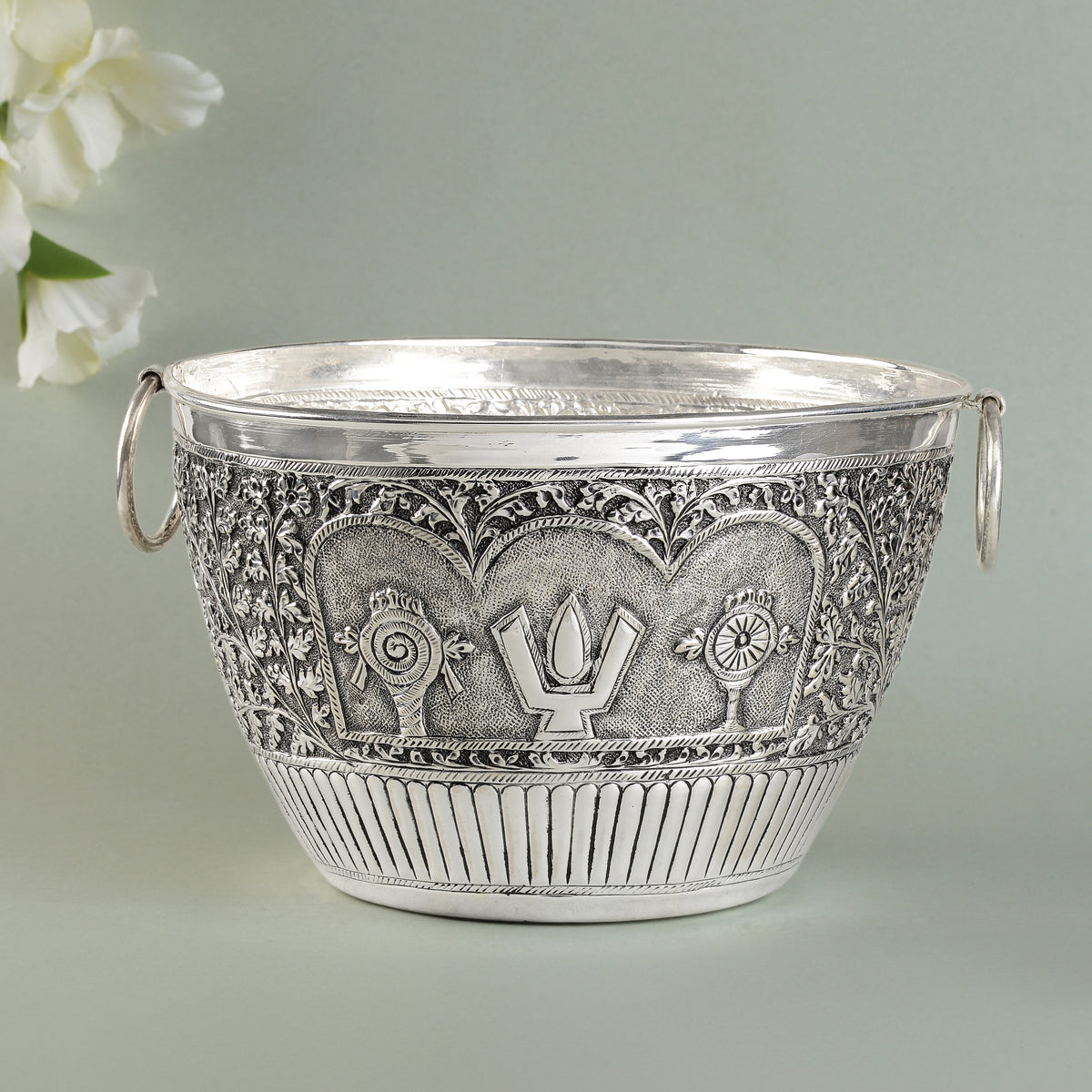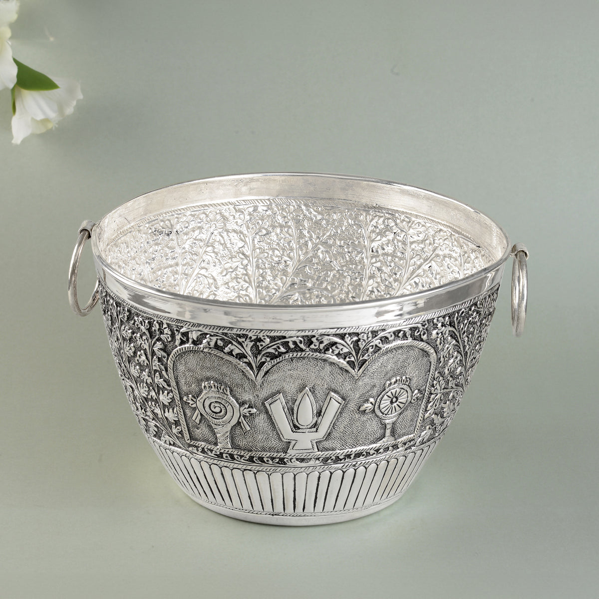 This Victorian 92.5 Silver Gangalam, with elegant leaf patterns and designs of Sankhu, Chakra, and Namam, features an antique finish. Its mix of floral and spiritual designs makes it perfect for offering holy water during pooja rituals.