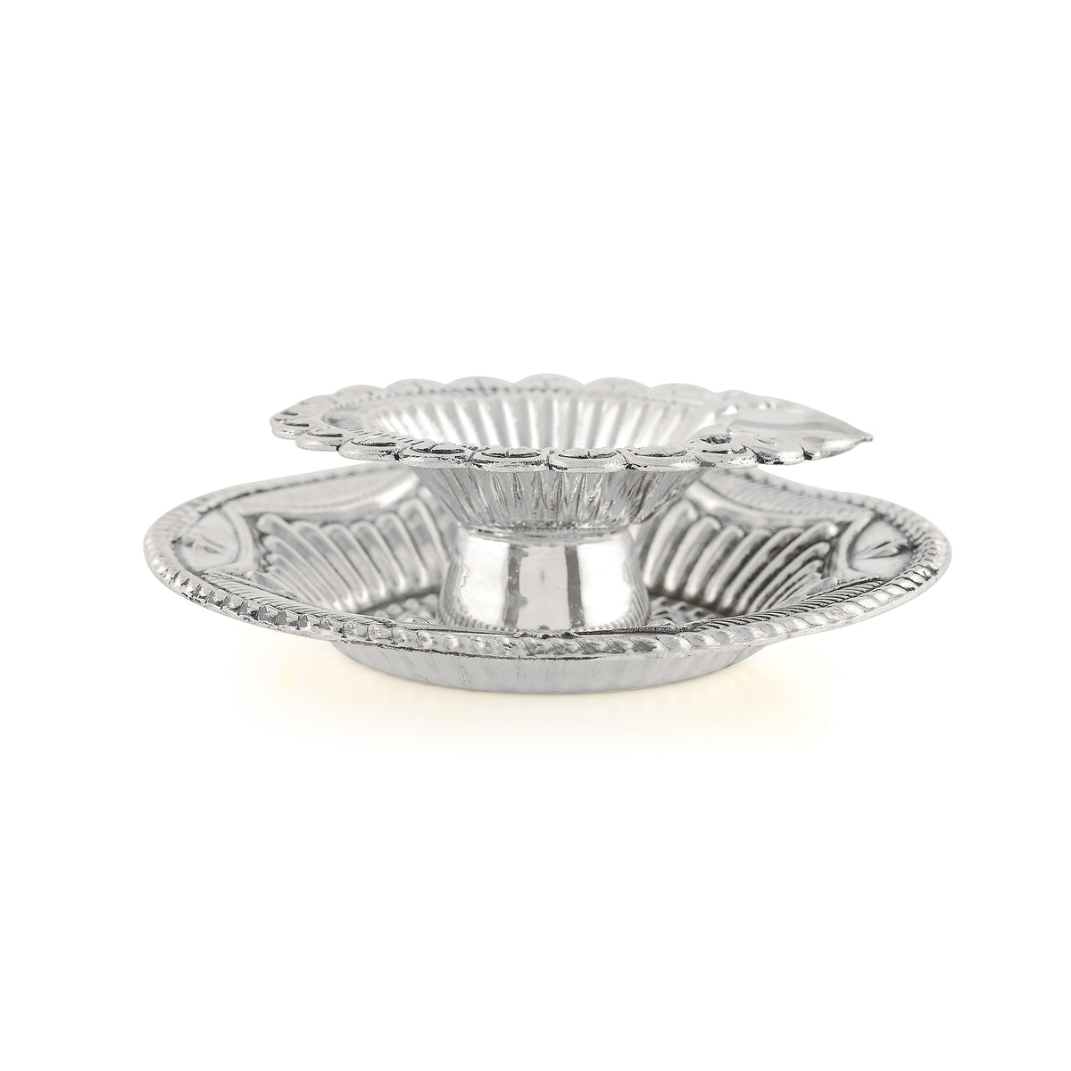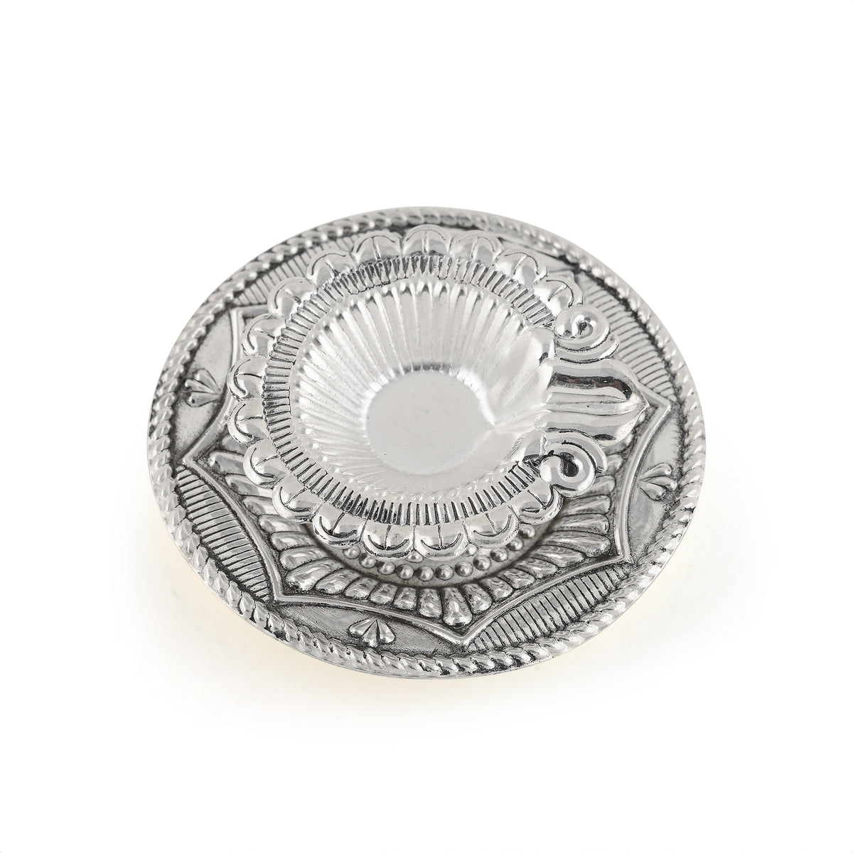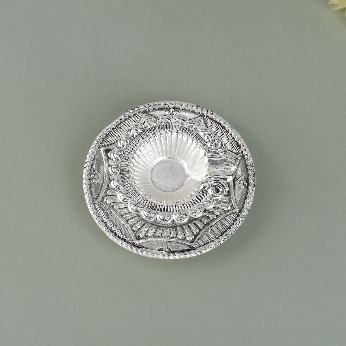 Enhance your home decor with our Silver Diya, featuring a stunning antique floral design. Made of high-quality silver, this decorative piece adds a touch of elegance and sophistication to any room. Expertly crafted and designed, it's perfect for those who appreciate timeless beauty and traditional aesthetics.