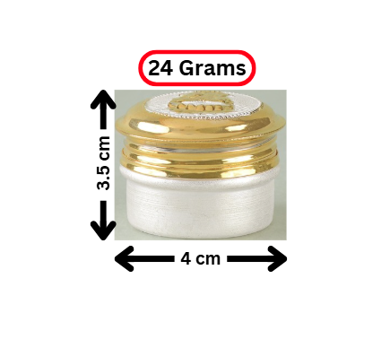 This elegantly designed Silver Laxmi Devi-Themed Kumkum Box with Gold Finish is the perfect addition to any household for storing Kumkum, a traditional Indian powder used for religious rituals. Crafted from high-quality silver with a beautiful gold finish, this kumkum box showcases intricate designs of the goddess Laxmi, adding a touch of spirituality to your home.