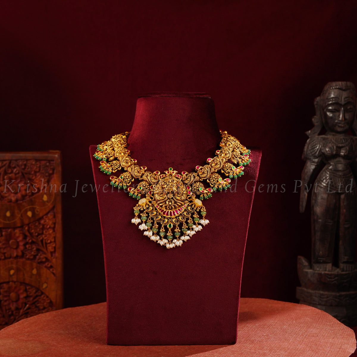 Crafted in heritage, worn with pride. This beautifully handcrafted 22K traditional Nakshi necklace is enriched with CZs, ruby-emerald pota, emerald beads and pearls. Perfect for weddings, temple ceremonies and festive occasions.