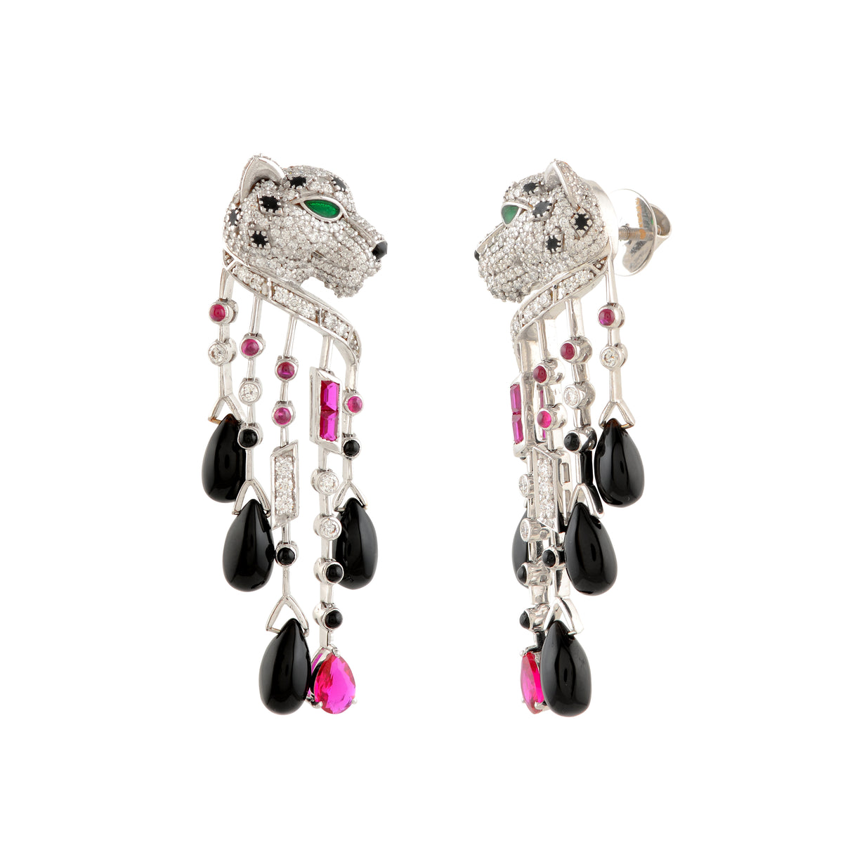 These unique dangling earrings are inspired by the beauty of a leopard, featuring a 3D leopard face stud. The earrings are crafted in white gold and enhanced with drops of black onyx and pink stones for a striking contrast. The leopard's eyes are accentuated with emerald stones, adding a touch of elegance.
