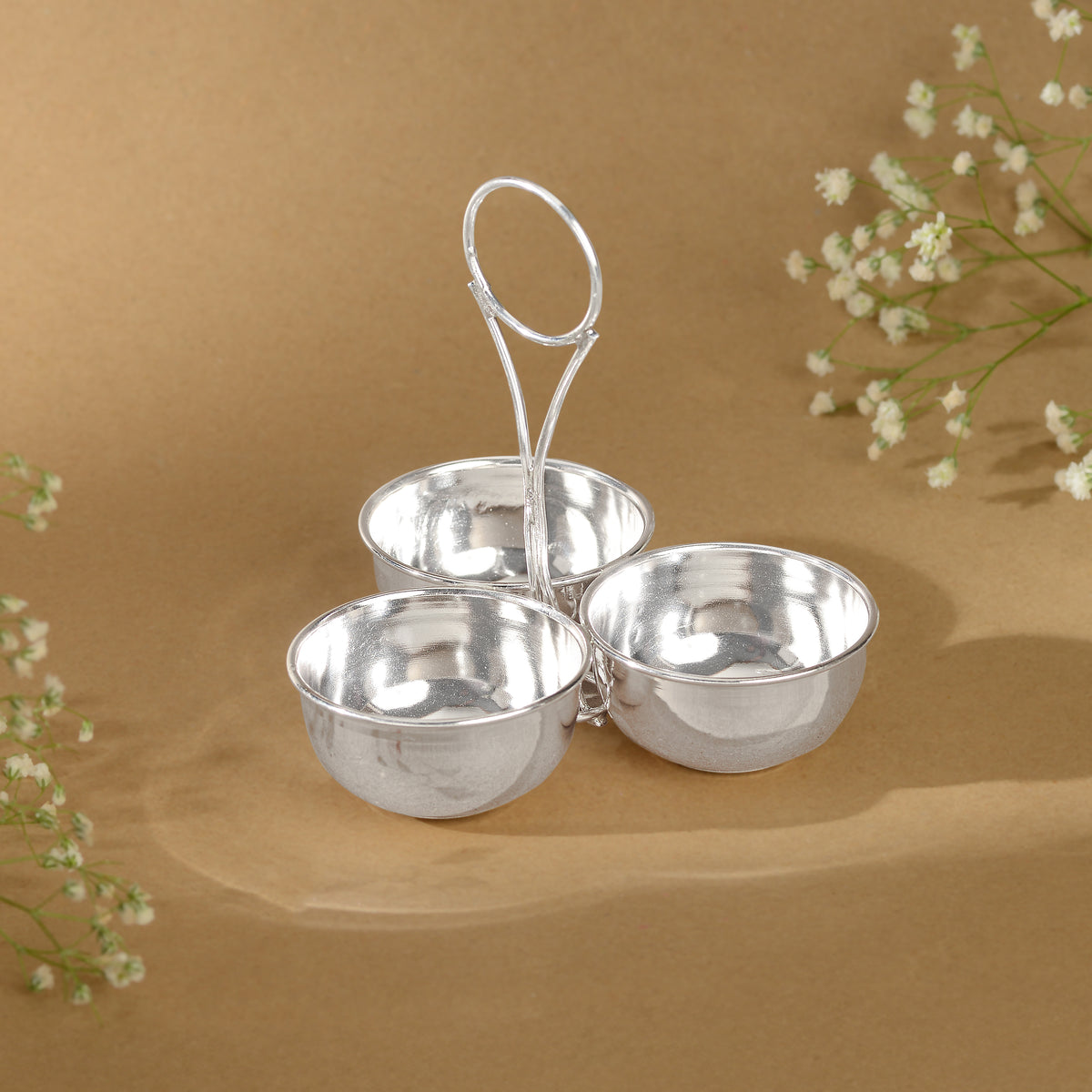 Enhance your sacred rituals with this charming 92.5 pure silver bowl Panchapali set. This elegant piece features two small, decorative bowls gracefully connected by a central handle or design element, making it ideal for holding kumkum, haldi (turmeric), chandan (sandalwood paste), or other sacred offerings during your daily pooja. The intricate detailing on the bowls and the connecting element showcases traditional craftsmanship and the radiant purity of sterling silver. Perfect for your home altar, gifting on auspicious occasions, or as a beautiful addition to your collection of spiritual accessories.