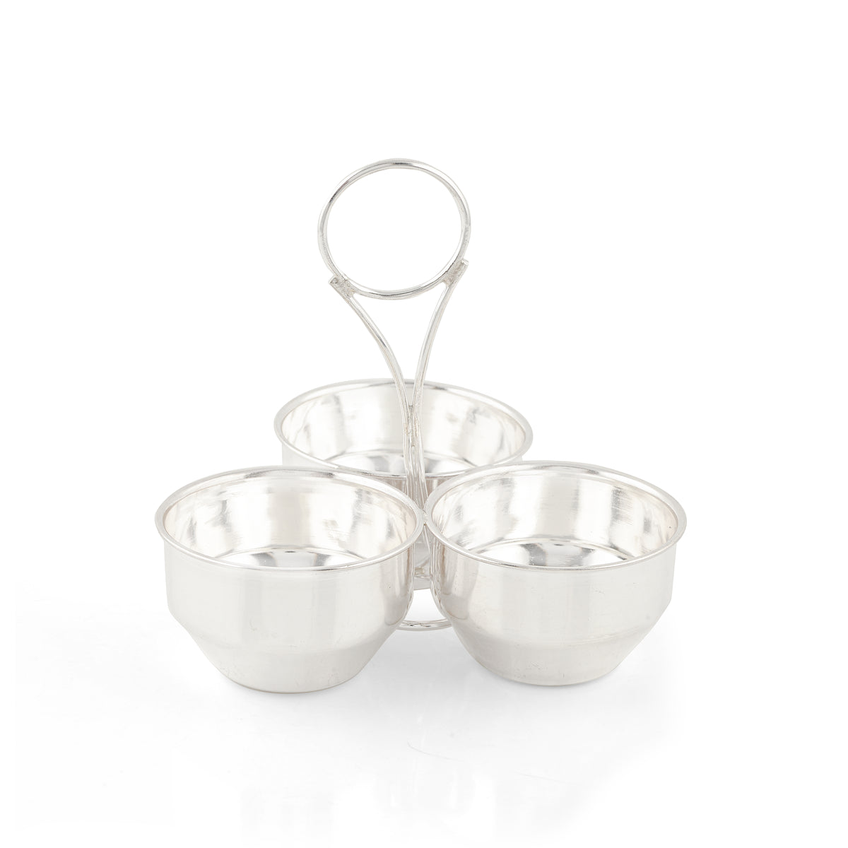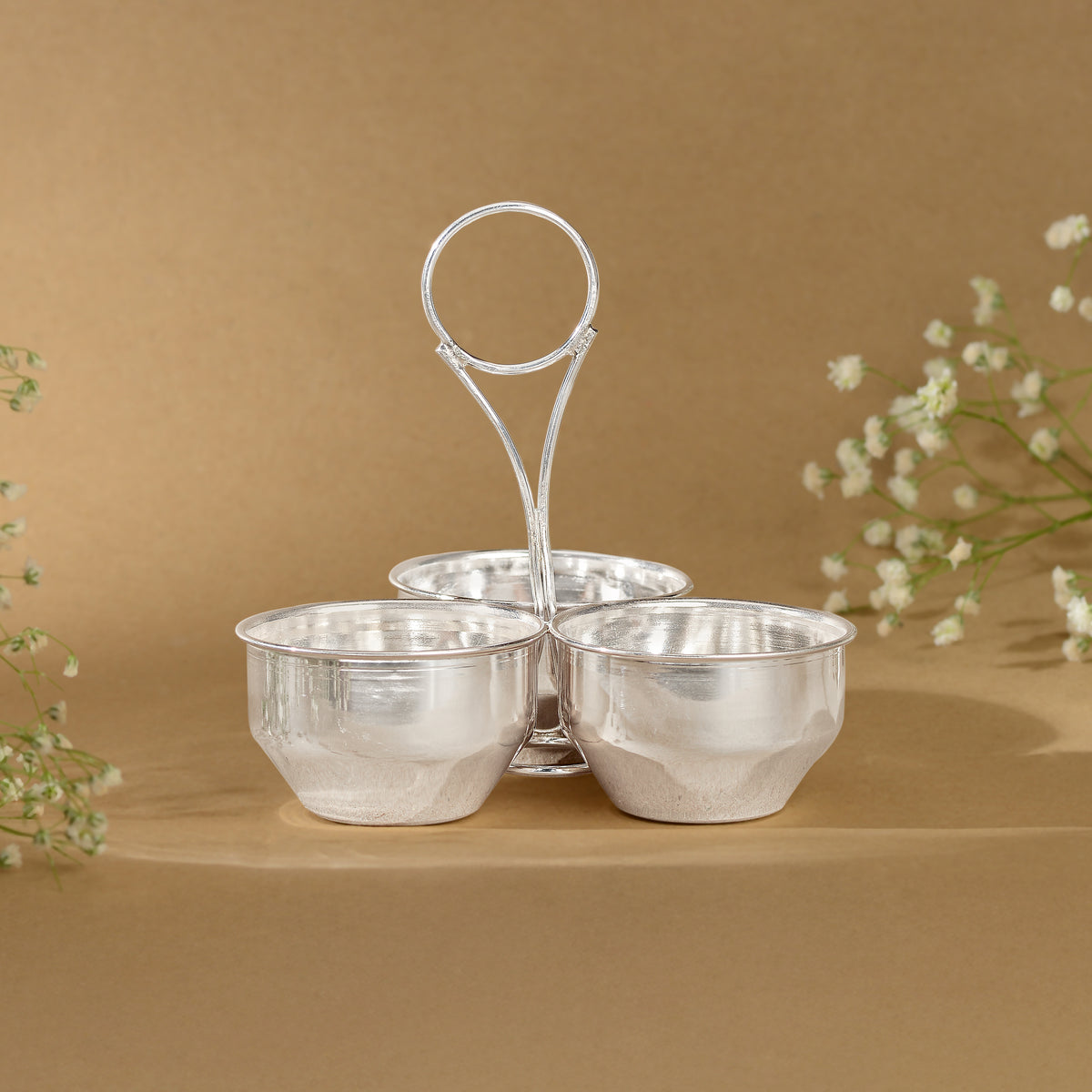 Enhance your sacred rituals with this charming 92.5 pure silver bowl Panchapali set. This elegant piece features two small, decorative bowls gracefully connected by a central handle or design element, making it ideal for holding kumkum, haldi (turmeric), chandan (sandalwood paste), or other sacred offerings during your daily pooja. The intricate detailing on the bowls and the connecting element showcases traditional craftsmanship and the radiant purity of sterling silver. Perfect for your home altar, gifting on auspicious occasions, or as a beautiful addition to your collection of spiritual accessories.