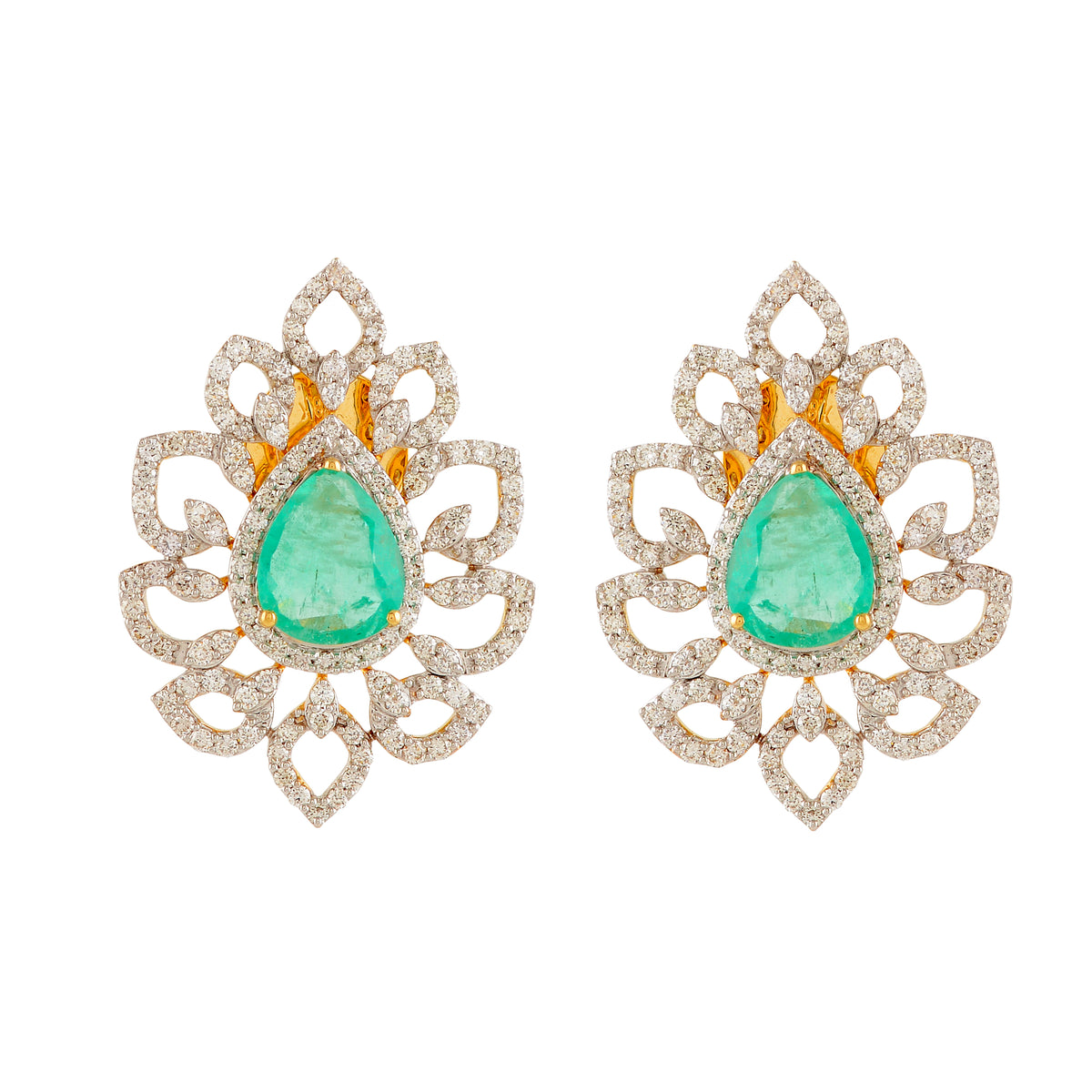 These flower-inspired stud earrings feature a modulated flower design, enhanced by a beautiful emerald at the center. The earrings are shaped like a pear to create a balanced look.