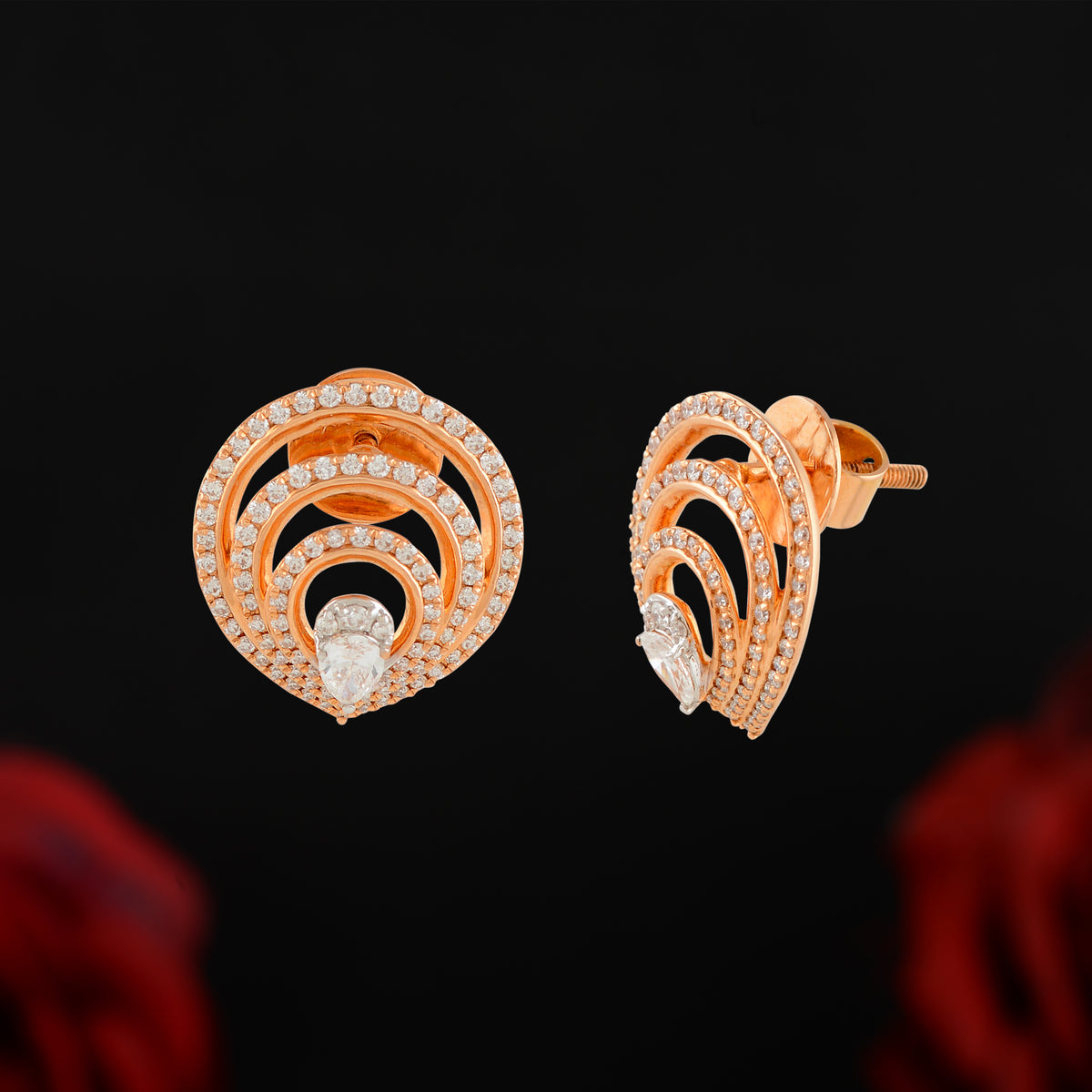 These elegant reverse pear-shaped studs feature a minimalistic design with a unique concentric motif. The pear stone is set in reverse, enhancing the distinctiveness of the piece.
