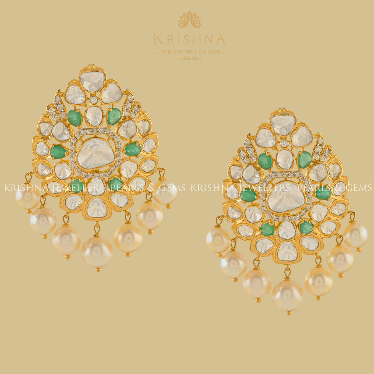 Mesmerizing polki dangle earrings adorned with dangling pearls. A harmonious blend of traditional and contemporary elements, exuding grace and elegance.