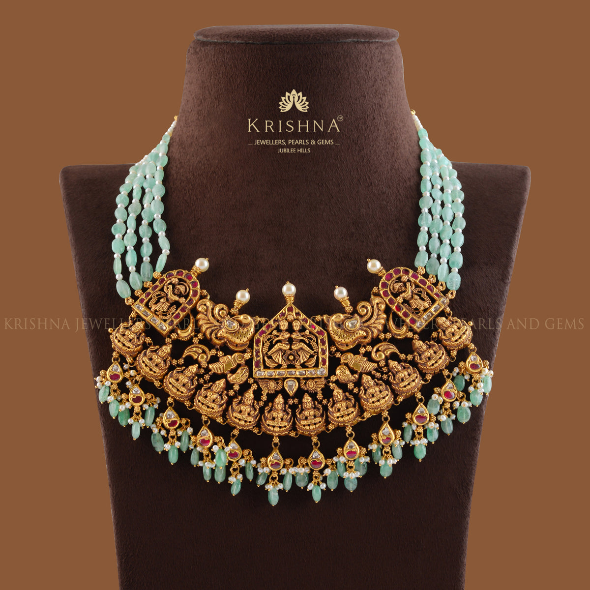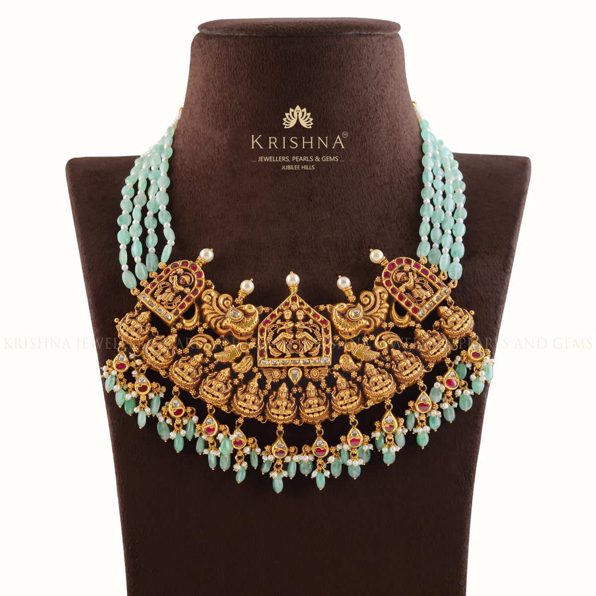 Transform your look with timeless allure! Introducing the Gold Lakshmi Motif Pendant, a fusion of tradition and elegance. Intricately detailed and adorned with Russian emerald beads, this piece exudes sophistication and spiritual charm. Elevate your style with the perfect blend of heritage and beauty.