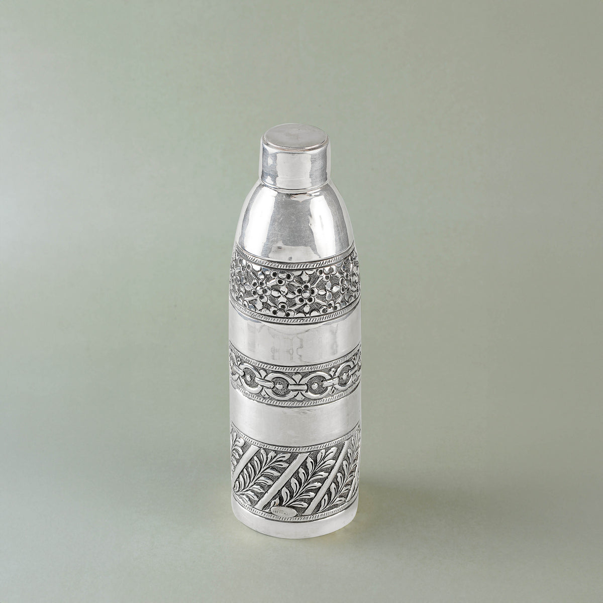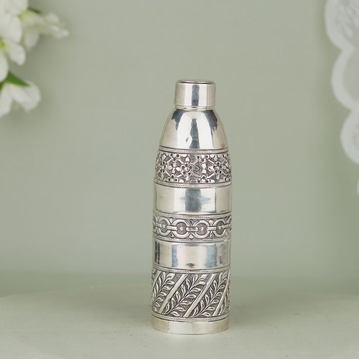 Crafted with 92.5% pure silver, the Silver Antique Floral Design Bottle adds a touch of elegance to any room. With intricate floral designs, this bottle combines beauty and functionality as a stunning decor piece or a storage container. Upgrade your home with this expertly crafted silver piece.