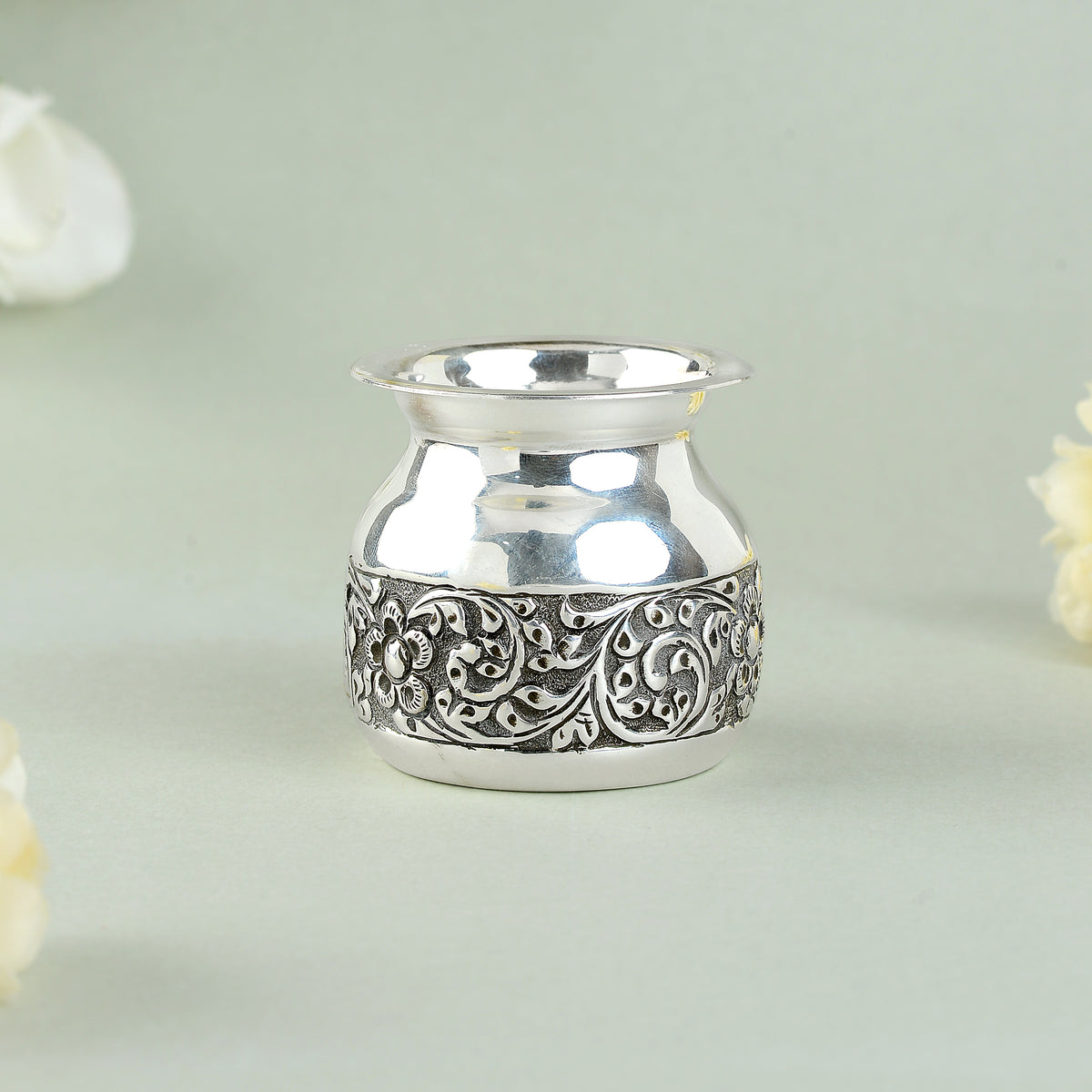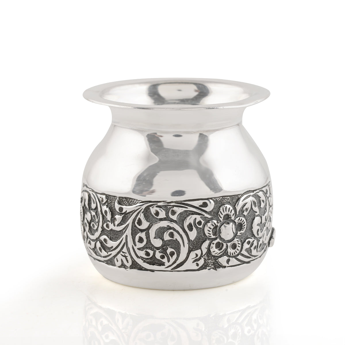 This Silver Chombu features a stunning antique finish and intricate floral design, perfect for adding a touch of elegance to any room. Made from high-quality silver, this chombu is not only aesthetically pleasing, but also durable and long-lasting. A must-have for any discerning collector or interior decorator.