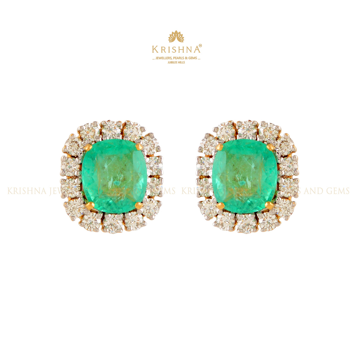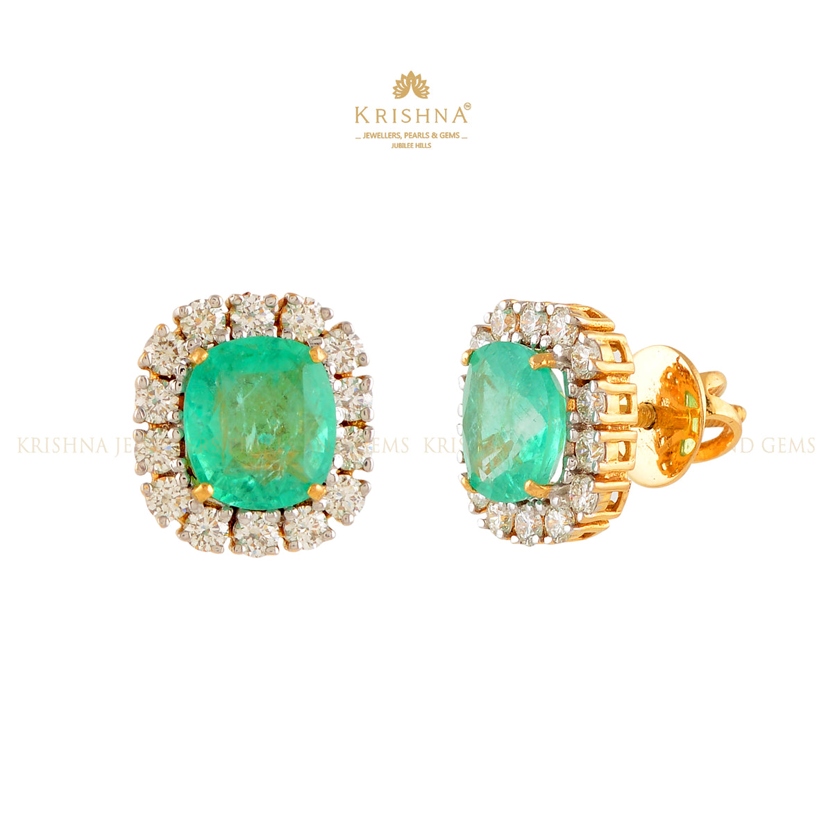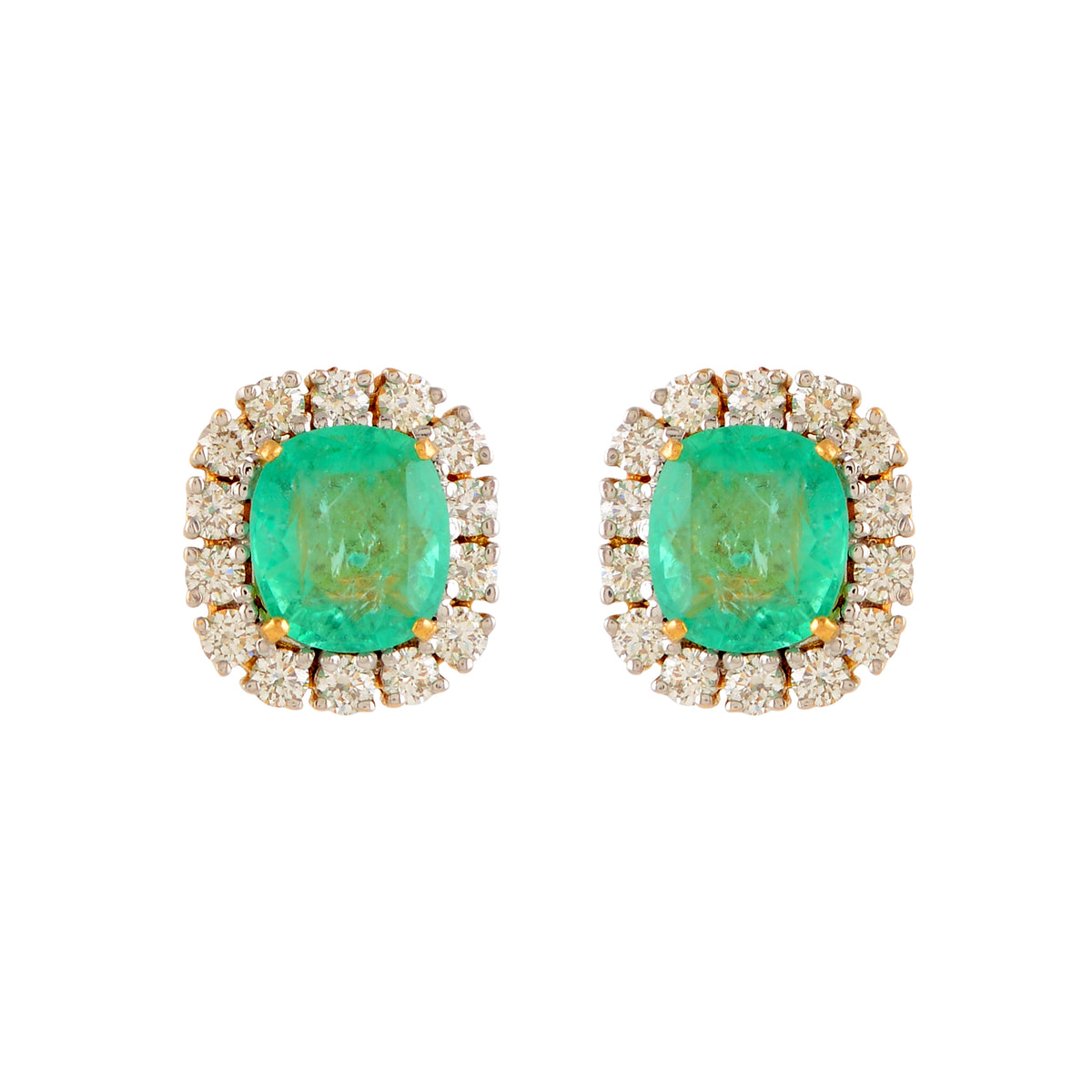 This simple stud features a unique geometric shape with an oval emerald at the center, adding a vibrant pop of color. The diamonds are strategically placed to enhance the overall design, giving it a contemporary look.